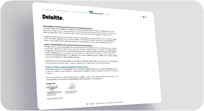 Responsibility of the Board of Directors for the Financial Statements The Board of Directors is responsible for the preparation of the financial statements in accordance with the provisions of Swiss law and the company’s articles of incorporation, and for such internal control as the Board of Directors determines is necessary to enable the preparation of financial statements that are free from material misstatement, whether due to fraud or error. In preparing the financial statements, the Board of Directors is responsible for assessing the entity’s ability to continue as a going concern, disclosing, as applicable, matters related to going concern and using the going concern basis of accounting unless the Board of Directors either intends to liquidate the entity or to cease operations, or has no realistic alternative but to do so. Auditor’s Responsibilities for the Audit of the Financial Statements Our objectives are to obtain reasonable assurance about whether the financial statements as a whole are free from material misstatement, whether due to fraud or error, and to issue an auditor’s report that includes our opinion. Reasonable assurance is a high level of assurance, but is not a guarantee that an audit conducted in accordance with Swiss law and Swiss Auditing Standards will always detect a material misstatement when it exists. Misstatements can arise from fraud or error and are considered material if, individually or in the aggregate, they could reasonably be expected to influence the economic decisions of users taken on the basis of these financial statements. A further description of our responsibilities for the audit of the financial statements is located at the website of EXPERTsuisse: http://expertsuisse.ch/en/audit-report-for-public-companies. This description forms part of our auditor’s report. Report on Other Legal and Regulatory Requirements In accordance with article 728a paragraph 1 item 3 CO and Swiss Auditing Standard 890, we confirm that an internal control system exists, which has been designed for the preparation of financial statements according to the instructions of the Board of Directors. We further confirm that the proposed appropriation of available earnings complies with Swiss law and the company’s articles of incorporation. We recommend that the financial statements submitted to you be approved. Deloitte SA Karine Szegedi Pingoud Laetitia Cejudo Petit Licensed Audit Expert Licensed Audit Expert Auditor in Charge Geneva, 27 January 2022 116 Givaudan — 2021 Governance, Compensation and Financial Report Governance Report Compensation Report Consolidated Financial Report Statutory Financial Report Appendix