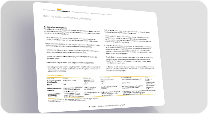 2.2 Executives and employees The ability to attract, motivate and retain the right talented employees globally is key to the continued success of Givaudan. Our competitive remuneration policy supports this ambition and is based on the following principles: – Pay for performance: through our variable pay plans, employees participate in the Company’s overall success and are rewarded for their contribution to business results. – Alignment of interests: Givaudan seeks to align management and shareholders’ interests by rewarding long-term value creation through share-based programmes. – External competitiveness: overall compensation positioning should enable Givaudan to attract and retain highly talented individuals critical to its success. – Internal consistency and fairness: internal pay scales reflect job level, function and geographic market. Givaudan’s total compensation in 2021 is composed of the following elements: – Base salary: base salaries are regularly benchmarked in each location and pay scales are reviewed annually according to local market evolution. As a general rule, pay scales are built around market median. – Profit Sharing Plan: non-management employees participate in the global Profit Sharing Plan. Payouts are based on yearly evolution of Group EBITDA. – Annual Incentive Plan: this plan covers all managers and executives globally. It rewards participants for the achievement of financial targets and other organisational and individual objectives. Depending on the achievement of performance criteria, payouts can vary between 0% and 200% of target payout. – Performance Share Plan: this plan links executives and selected manager compensation to the evolution of the Givaudan share price and long-term business objectives through the award of performance shares. Depending on the achievement of performance criteria, participants may receive between zero and two Givaudan shares per performance share at the end of the three-year vesting period. – Benefits (indirect compensation): benefit plans seek to address current and future security needs of employees. These generally include retirement, health, death and disability benefits. Benefits-in-kind such as Company vehicles are offered to certain employees according to local market practice. As illustrated in table II, every Givaudan employee’s remuneration is linked to Company performance through cash-based and/or share-based variable pay plans and is aligned with Givaudan’s compensation principles. II. Givaudan compensation Compensation Base salary Profit Sharing Plan Annual Incentive Plan ¹ Performance Share Plan ¹ Benefits Participants (number of participants) All employees (17,000) Non-management employees (12,000) Managers and executives (5,000) Executives and selected managers (500) All employees (17,000) Payout Cash Cash Cash Givaudan shares ² Insurances, pension, fringe benefits Link to compensation principles Attract and retain highly talented individuals. Provides internal consistency and fairness Contribution to Group financial objectives Contribution to Group financial objectives Alignment of management with long-term targets and shareholders' interests Protection against risk, attract and retain Alignment with the 2025 strategy Nurture a pipeline of industry experts and future leaders to develop skills for sustained success Reward our people to share in Group profit Achieve annual organic sales growth and EBITDA target and individual performance objectives Achieve long-term organic sales growth and free cash flow targets, as well as people and nature ambitions linked to the Givaudan purpose Same as base salary 1. The Annual Incentive Plan and Perforamnce Share Plan are described in more detail in the next sections. 2. Unless local laws prevent allocation of Givaudan shares, in which case payout is in cash. Reflecting business and individual performance Governance Report Compensation Report Consolidated Financial Report Statutory Financial Report Appendix 25 Givaudan — 2021 Governance, Compensation and Financial Report