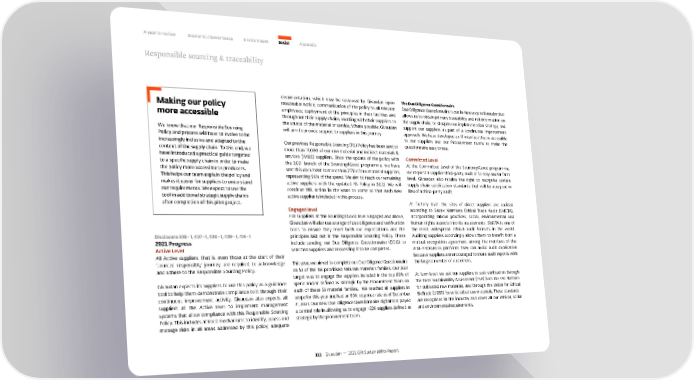 A year in review Economic / Governance Environment Social Appendix Responsible sourcing & traceability documentation, which may be reviewed by Givaudan upon The Due Diligence Questionnaire Making our policy reasonable notice; communication of the policy to all relevant Due Diligence Questionnaire is our in-house questionnaire that employees; deployment of the principles in their facilities and allows us to obtain primary traceability and risk information on more accessible throughout their supply chains, working with their suppliers to the supply chain; to sharpen our implementation strategy, and the source of the material or service. Where possible, Givaudan support our suppliers as part of a continuous improvement We know that our Responsible Sourcing will aim to provide support to suppliers in this journey. approach. We have developed an IT interface that is accessible Policy and process will have to evolve to be to our suppliers and our Procurement teams to make the increasingly inclusive and adapted to the Our previous Responsible Sourcing (RS) Policy has been sent to questionnaire easy to use. context of the supply chain. To this end, we more than 14,000 of our raw material and indirect materials & have introduced a practical guide targeted services (IM&S) suppliers. Since the update of the policy with Committed Level to a specific supply chain in order to make the 2021 launch of the Sourcing4Good programme, we have At the Committed Level of the Sourcing4Good programme, the policy more accessible to producers. sent this document to more than 2170 of raw material suppliers, we request a supplier third-party audit at factory and/or farm This helps our team explain the policy and representing 96% of the spend. We aim to reach our remaining level. Givaudan also retains the right to recognise certain makes it easier for suppliers to understand active suppliers with the updated RS Policy in 2022. We will supply chain certification standards that will be accepted in our requirements. We expect to use the continue this action in the years to come so that each new lieu of a third-party audit. tool in additional strategic supply chains active supplier is included in this process. after completion of this pilot project. At factory level, the sites of direct suppliers are audited Engaged level according to Sedex Members Ethical Trade Audit (SMETA). For suppliers at the Sourcing4Good level Engaged and above, Incorporating labour practices, social, environmental and Givaudan will also use a range of due diligence and verification human rights aspects into its assessments, SMETA is one of tools to ensure they meet both our expectations and the the most widespread ethical audit formats in the world. Disclosure 308 – 1, 407 – 1, 408 – 1, 409 – 1, 414 – 1 principles laid out in the Responsible Sourcing Policy. These Auditing suppliers accordingly allows them to benefit from a 2021 Progress include sending our Due Diligence Questionnaire (DDQ) to mutual recognition agreement among the members of the Active Level selected suppliers and requesting it to be completed. AIM-PROGRESS platform: they can avoid audit duplication All Active suppliers, that is, even those at the start of their because suppliers are encouraged to share audit reports with ‘sourced responsibly’ journey, are required to acknowledge This year, we aimed to complete our Due Diligence Questionnaire the largest number of customers. and adhere to the Responsible Sourcing Policy. on 53 of the 158 prioritised Naturals materials families. Our 2021 target was to engage the suppliers included in the top 80% of At farm level, we ask our suppliers to seek verification through Givaudan expects its suppliers to use this policy as a guidance spend and/or defined as strategic by the Procurement Team on the Farm Sustainability Assessment (FSA) from the SAI Platform tool to help them demonstrate compliance to it through their each of these 53 material families. We reached all suppliers in for cultivated raw materials, and through the Union for Ethical continuous improvement activity. Givaudan also expects all scope for this year and had an 89% response rate as of December BioTrade (UEBT) for wildcrafted raw materials. These standards suppliers at the Active level to implement management 31, 2021. Our new Due Diligence Questionnaire digital tool played are recognised in the industry and cover all our ethical, social systems that allow compliance with this Responsible Sourcing a central role in allowing us to engage ~226 suppliers defined as and environmental requirements. Policy. This includes at least mechanisms to identify, assess and strategic by the procurement team. manage risks in all areas addressed by this policy; adequate 111 Givaudan — 2021 GRI Sustainability Report