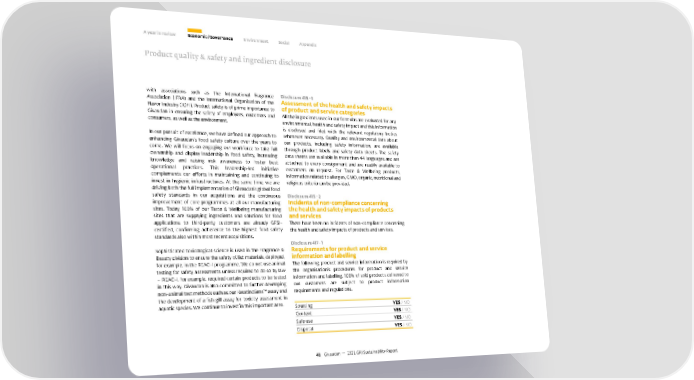 A year in review Economic / Governance Environment Social Appendix Product quality & safety and ingredient disclosure with associations such as the International Fragrance Disclosure 416 – 1 Association (IFRA) and the International Organization of the Assessment of the health and safety impacts Flavor Industry (IOFI). Product safety is of prime importance to of product and service categories Givaudan in ensuring the safety of employees, customers and All the ingredients used in our formulas are evaluated for any consumers, as well as the environment. environmental, health and safety impact and this information is disclosed and filed with the relevant regulatory bodies In our pursuit of excellence, we have defined our approach to whenever necessary. Quality and environmental data about enhancing Givaudan’s food safety culture over the years to our products, including safety information, are available come. We will focus on engaging our workforce to take full through product labels and safety data sheets. The safety ownership and display leadership in food safety, increasing data sheets are available in more than 44 languages and are knowledge and raising risk awareness to foster best attached to every consignment and are readily available to operational practices. This leadership-led initiative customers on request. For Taste & Wellbeing products, complements our efforts in maintaining and continuing to information related to allergen, GMO, organic, nutritional and invest in hygienic infrastructures. At the same time, we are religious criteria can be provided. driving both the full implementation of Givaudan’s global food safety standards in our acquisitions and the continuous Disclosure 416 – 2 improvement of core programmes at all our manufacturing Incidents of non-compliance concerning sites. Today, 100% of our Taste & Wellbeing manufacturing the health and safety impacts of products sites that are supplying ingredients and solutions for food and services applications to third-party customers are already GFSI- There have been no incidents of non-compliance concerning certified, confirming adherence to the highest food safety the health and safety impacts of products and services. standards also within most recent acquisitions. Disclosure 417 – 1 Sophisticated toxicological science is used in the Fragrance & Requirements for product and service Beauty division to ensure the safety of list materials, deployed, information and labelling for example, in the REACH programme. We do not use animal The following product and service information is required by testing for safety assessments unless required to do so by law the organisation’s procedures for product and service – REACH, for example, required certain products to be tested information and labelling. 100% of sold products delivered to in this way. Givaudan is also committed to further developing our customers are subject to product information non-animal test methods such as our KeratinoSens™ assay and requirements and regulations. the development of a fish gill assay for toxicity assessment in aquatic species. We continue to invest in this important area. Sourcing YES / NO Content YES / NO Safe use YES / NO Disposal YES / NO 41 Givaudan — 2021 GRI Sustainability Report