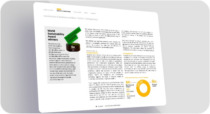 A year in review Economic / Governance Environment Social Appendix Governance & business conduct / ethics / transparency The Purpose Management Office (PMO), led by the purpose and employee safety in People. The PSP is thus designed to World project lead, is responsible for both supporting the embedding reward executives and key talent who significantly influence of the Purpose within the business agenda at the EC and the long-term success of the business and our purpose Sustainability leadership team levels as well as for helping identify ways of ambitions. Award cascading it down the organisation. Such targets underpin our purpose aspirations, and a clear winners The divisions and functions leadership teams integrate the methodology and sufficient data will ensure that the targets are purpose / sustainability ambitions into strategic plans and appropriate. All the non-financial metrics used in the new PSP Givaudan won the allocate the resources that will make the difference in will be rigorously measurable and audited, increasing world Sustainability delivering on our purpose / sustainability agenda. transparency. The chart below reflects the proportion of Team Award from contribution from the three focus areas of the Givaudan purpose. Sustainability Leaders, a Disclosure 102 – 35 global community- Compensation Transparency intelligence network for Chief Givaudan aims to attract, motivate and retain a diverse pool of Transparency and openly sharing information isn’t just about Sustainability Officers and ESG highly talented people to sustain our leadership position in our compliance; it’s a means of bolstering accountability and executives. Judges awarded us the prize, industry. Our compensation policies are an essential component engagement, and, ultimately, trust. Transparency and clear, which recognises teams who have of this strategy and as such a key driver of organisational open communication are essential to inclusive stakeholder demonstrated creativity, determination performance. Our compensation programmes reflect the engagement and building solid long-term relationships. These and resilience to drive positive change, performance of the business and of individuals and are aligned relationships give us a deep understanding of the most due to the breadth of the team working with our ambition of ensuring that Givaudan is a place where relevant topics for different groups of stakeholders, on sustainability, including many people everyone feels welcome, valued and inspired. We have rigorous permitting us, in turn, to align our business performance with whose roles incorporate sustainability governance, policies and processes to ensure that our the expectations of our stakeholders and with society in outside of the core team; the many compensation practices are aligned with our principles of general, adding to our long-term success. projects the team has implemented and integrity, fairness and transparency. The Compensation the tens of thousands of people Committee supports the Board of Directors (Board) in Performance Share Plan for top 500 employees positively impacted. establishing and reviewing compensation policies. From 1 January 2021, we introduced a new Performance Share 20% 80% Plan (PSP) aligned with the Givaudan purpose focus areas. Non-financial Financial While we have retained the financial metrics traditionally used targets targets to calculate the PSP, they have been complemented by 10% nonfinancial criteria linked to three of the focus areas of the Givaudan purpose. Within the three focus areas, calculation Social targets criteria in the new PSP are: sales and free cash flow in 10% Creations; net greenhouse gas (GHG) emissions reduction in Environmental scope 1, 2 and 3 in Nature, and gender diversity, nationality mix targets 36 Givaudan — 2021 GRI Sustainability Report