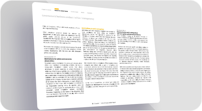 A year in review Economic / Governance Environment Social Appendix Governance & business conduct / ethics / transparency Ethics & Compliance Officer with local compliance officers Anti-bribery & anti-corruption Disclosure 205 – 2 and corporate functions. Anti-bribery and anti-corruption compliance are managed as Communication and training about focus compliance risk areas within our Compliance anti-corruption policies and procedures Other compliance processes include the selection and Management System. The approach is anchored in our Basic compliance training on the updated Principles of engagement of third-party agents and distributors and the Principles of Conduct, which state that Givaudan has zero Conduct, mandatory for all permanent employees once every global supplier selection process of the Procurement tolerance for bribery and corruption and does not make two years, includes sections on bribery and corruption and organisation. The Corporate Ethics & Compliance Officer reports facilitation payments. This principle is further detailed in two the ethical handling of issues linked to gifts, entertainment regularly to the Board of Directors, the Audit Committee of the policies: Givaudan’s Global Anti-Bribery, Gift, Entertainment and hospitality. Board, the Executive Committee and the CEO. and Hospitality policy, first enacted in 2011 and last amended in 2019, includes prohibitions on corruption, bribery, inappropriate We have also introduced specific anti-bribery training for We monitor for compliance via numerous measures. We ask all gifts as well as mechanisms for the approval and reporting of employees with significant contact to external stakeholders. Local Compliance Officers to certify the compliance of their gifts, entertainment and hospitality. Givaudan’s Global This group of senior managers includes all members of the country organisations with the laws and with Givaudan’s Charitable Giving and Community Support policy, also last Executive Committee and other employees whose work policies once annually. amended in 2019, provides mandatory guidelines on permitted involves regular and direct contact with external stakeholders. charitable causes, due diligence on recipients, and reporting. Givaudan senior managers have been invited to complete this Disclosure 102 – 17 The Principles of Conduct and the two policies are available to specific anti-bribery training since 2013. The latest training Mechanisms for advice and concerns employees in all major Company languages. was rolled out from Q4 2021 onwards. The completion rate about ethics for Givaudan employees, including Naturex employees, Givaudan’s various mechanisms for advice and concerns about The Corporate Ethics & Compliance Officer regularly reviews currently stands at 85%. ethics also contribute to monitoring activities. We have a corruption and bribery risks as part of compliance risk Group-wide Compliance Helpline system that allows assessment, which is done at both the local and corporate With further acquisitions over the past years, we have continued employees to report suspected or actual misconduct or levels. The results are presented to the Executive Committee, to roll out our ethics and compliance programme, which includes violations of the Company’s policies on a confidential basis and the Audit Committee and the Board of Directors. Given that training for employees in the acquired companies. Depending on without fear of retaliation. The helpline consists of a telephony they present a specific risk group, Givaudan has a process for the integration status of the acquired company, the training and a web intake. It is serviced by a third-party provider and is the selection and engagement of sales agents and distributors programme is available either online or offline in all relevant available at all sites worldwide 24/7 and in all major languages that includes a formal due diligence review and requirements languages. The basic training includes essentially the same spoken at the Company. We also have a dedicated grievance for agent contracts and payments. material on anti-bribery, corruption and corporate social email channel that allows third parties to report alleged non- responsibility as the basic training for Givaudan employees. compliance or other issues. This mechanism is mentioned in In the case of acquisitions, we conduct pre-signing due Additional compliance training may be introduced as a result of our Responsible Sourcing Policy. All reported cases are diligence and full integration of acquired companies into the pre-acquisition due diligence. reviewed and investigated as appropriate in accordance with Compliance and Ethics Management system upon closing. Givaudan’s Global Compliance Incident Investigation Procedure. Depending on the nature of the allegations, these cases are handled either locally or centrally. Where required, external specialist support is sought. 32 Givaudan — 2021 GRI Sustainability Report