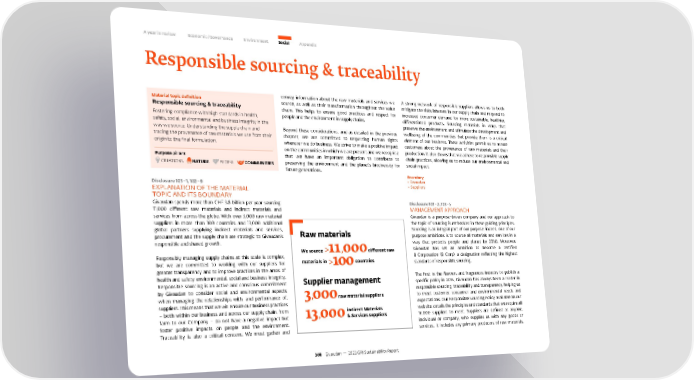 A year in review Economic / Governance Environment Social Appendix Responsible sourcing & traceability convey information about the raw materials and services we A strong network of responsible suppliers allows us to both Material topic definition source, as well as their transformation throughout the value mitigate the risks inherent in our supply chain and respond to Responsible sourcing & traceability chain. This helps to ensure good practices and respect for increased consumer demand for more sustainable, healthier, Fostering compliance with high standards in health, people and the environment in supply chains. differentiated products. Sourcing materials in ways that safety, social, environmental and business integrity in the preserve the environment and stimulate the development and way we source. Understanding the supply chain and Beyond these considerations, and as detailed in the previous wellbeing of the communities that provide them is a critical tracing the provenance of raw materials we use from their chapter, we are committed to respecting human rights element of our business. These activities permit us to assure origin to the final formulation. wherever we do business. We strive to make a positive impact customers about the provenance of raw materials and their on the communities in which we are present and we recognise production. It also shows that we adhere to responsible supply Purpose pillars that we have an important obligation to contribute to chain practices, allowing us to reduce our environmental and CREATIONS NATURE PEOPLE COMMUNITIES preserving the environment and the planet’s biodiversity for social impact. future generations. Boundary Disclosure 103 – 1, 102 – 9 • Givaudan EXPLANATION OF THE MATERIAL • Suppliers TOPIC AND ITS BOUNDARY Givaudan spends more than CHF 3.8 billion per year sourcing Disclosure 103 – 2, 103 – 3 11,000 different raw materials and indirect materials and MANAGEMENT APPROACH services from across the globe. With over 3,000 raw material Givaudan is a purpose-driven company and our approach to suppliers in more than 100 countries and 13,000 additional the topic of sourcing is embedded in these guiding principles. global partners supplying indirect materials and services, Raw materials Sourcing is an integral part of our purpose: indeed, one of our procurement and the supply chain are strategic to Givaudan’s purpose ambitions is to source all materials and services in a responsible and shared growth. way that protects people and planet by 2030. Moreover, We source >11,000 different raw Givaudan has set an ambition to become a certified Responsibly managing supply chains at this scale is complex, B Corporation (B Corp), a designation reflecting the highest but we are committed to working with our suppliers for materials in countries standards of responsible sourcing. > 100 greater transparency and to improve practices in the areas of health and safety, environmental, social and business integrity. Supplier management The first in the flavours and fragrances industry to publish a Responsible sourcing is an active and conscious commitment specific policy in 2016, Givaudan has always been a leader in by Givaudan to consider social and environmental aspects responsible sourcing, traceability and transparency, helping us when managing the relationships with, and performance of, 3,000 raw material suppliers to meet customer, consumer and environmental needs and suppliers. This means that we will ensure our business practices expectations. Our Responsible Sourcing Policy, available on our – both within our business and across our supply chain, from 13,000indirect Materials website, details the principles and standards that we require all farm to our Company – do not have a negative impact but & Services suppliers 16,000 suppliers to meet. Suppliers are defined as anyone, foster positive impacts on people and the environment. individual or company, who supplies us with any goods or Traceability is also a critical concern. We must gather and services. It includes any primary producers of raw materials, 108 Givaudan — 2021 GRI Sustainability Report