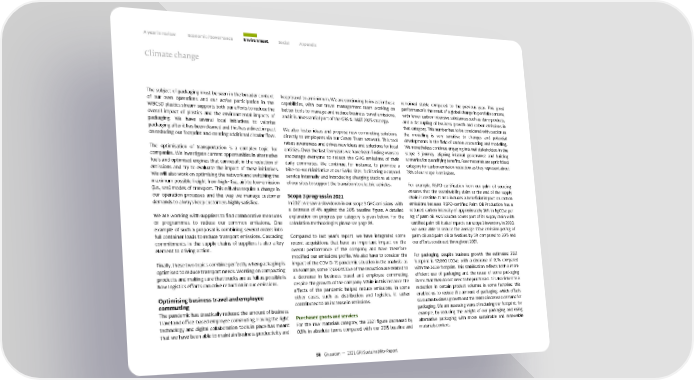 A year in review Economic / Governance Environment Social Appendix Climate change keep travel to a minimum. We are continuing to invest in these remained stable compared to the previous year. This good The subject of packaging must be seen in the broader context of our own operations and our active participation in the capabilities, with our travel management team working on performance is the result of a global change in portfolio content, WBCSD plastics stream supports both our efforts to reduce the better tools to manage and reduce business travel emissions, with fewer carbon-intensive substances such as dairy products, overall impact of plastics and the environmental impacts of and it is an essential part of the GBS & IM&T 2025 strategy. and a decoupling of business growth and carbon emissions in packaging. We have several local initiatives to valorise that category. This number has to be considered with caution as packaging after it has been cleaned and this has a direct impact We also foster ideas and propose new commuting solutions the modelling is very sensitive to changes and potential on reducing our footprint and creating additional circular flow. directly to employees via our Green Team network. This tool developments in the field of carbon accounting and modelling. raises awareness and drives new ideas and solutions for local We nonetheless continue engaging internal stakeholders in the The optimisation of transportation is a complex topic for entities. Over the last few years we have been finding ways to scope 3 journey, aligning internal governance and building companies. We investigate current opportunities in alternative encourage everyone to reduce the GHG emissions of their scenarios for quantifying benefits. Raw materials are a prioritised fuels and optimised engines that can result in the reduction of daily commutes. We continue, for instance, to promote a category for carbon emission reduction as they represent about emissions and try to evaluate the impact of these initiatives. bike-to-work initiative at our Swiss sites, facilitating a carpool 78% of our scope 3 emissions. We will also work on optimising the network and switching the service internally and introducing charging stations at some maximum possible freight from high- (i.e., air) to low-emission of our sites to support the transition to electric vehicles. For example, RSPO certification from our palm oil sourcing (i.e., sea) modes of transport. This will also require a change in ensures that the sustainability claim at the end of the supply our operation processes and the way we manage customer Scope 3 progress in 2021 chain is credible. It also includes a beneficial impact on carbon demands to always keep customers highly satisfied. In 2021, we saw a slowdown in our scope 3 GHG emissions with emissions because RSPO-certified Palm Oil Production has a a decrease of 4% against the 2015 baseline figure. A detailed reduced carbon intensity of approximately 36% in kgCO₂e per We are working with suppliers to find collaborative measures explanation on progress per category is given below. For the kg of palm oil. As Givaudan covers part of its supply chain with or programmes to reduce our common emissions. One calculation methodologies please see page 84. certified palm oil, it also impacts our scope 3 inventory. In 2020, example of such a proposal is combining several orders into we were able to reduce the average CO₂e emission per kg of full container loads to reduce transport emissions. Cascading Compared to last year’s report, we have integrated some palm oil and palm oil derivatives by 5% compared to 2015 and commitments in the supply chains of suppliers is also a key recent acquisitions that have an important impact on the our efforts continued throughout 2021. element to driving action. overall performance of the company and have therefore modified our emissions profile. We also have to consider the For packaging, despite business growth, the estimated 2021 Finally, these two topics combine perfectly when packaging is impact of the COVID-19 pandemic situation in the analysis: as footprint is 92,000 tCO₂e, with a decrease of 0.1% compared optimised to reduce transport needs. Working on compacting an example, some 17,000 tCO₂e of the reduction are related to with the 2020 footprint. This stabilisation reflects both a more products and making sure that trucks are as full as possible is a decrease in business travel and employee commuting, efficient use of packaging and the reuse of some packaging how logistics efforts can drive reduction in our emissions. despite the growth of the company. While in this instance the items that then do not need to be purchased. It is also linked to a effects of the pandemic helped reduce emissions, in some reduction in certain product volumes in some factories: this Optimising business travel and employee other cases, such as distribution and logistics, it rather enabled us to reduce the amount of packaging, which offsets commuting contributed to an increase in emissions. Givaudan business growth and the related increased demand for The pandemic has drastically reduced the amount of business packaging. We are assessing ways of reducing our footprint, for travel and office-based employee commuting. Having the right Purchased goods and services example, by reducing the weight of our packaging and using technology and digital collaboration tools in place has meant For the raw materials category, the 2021 figure decreased by alternative packaging with more sustainable and renewable that we have been able to maintain business productivity and 0.8% in absolute terms compared with our 2015 baseline and materials content. 58 Givaudan — 2021 GRI Sustainability Report