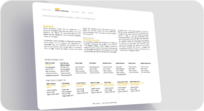 A year in review Economic / Governance Environment Social Appendix Governance & business conduct / ethics / transparency Governance controls and monitoring systems. Our rigorous governance Givaudan’s Board of Directors is responsible for the ultimate Strong governance systems are the cornerstone of a policies and processes ensure that our compensation direction, strategic supervision and control of Givaudan and its successful, sustainable organisation and help us to live and practices are aligned with our principles of integrity, fairness management. Our Board of Directors ensures the Company implement our Purpose, the overarching guidelines that and transparency. operates according to Swiss and international business ensure that the company is a force for good for business, standards and practices. Each of the eight Board members has society, and the planet. Disclosure 102 – 18 an in-depth knowledge of his or her relevant areas of expertise Governance structure and contributes to the Board’s competencies at the level of the At Givaudan, we pride ourselves on transparent governance, Our governance structure and processes aim to engage all full Board and in the Board’s four committees: Audit; which ensures we are managed and supervised in a stakeholders transparently and contribute to the creation of Compensation; Nomination and Governance; and Innovation. responsible way. Our structures and processes for the a fair, inclusive business. Robust standards, policies and The Board’s knowledge and diversity of experience are direction and control of our Company allow for a continued management systems provide a framework for addressing risks important assets in leading a company of Givaudan’s size in a focus on value creation and include internal and external and opportunities through operations and allow us to measure complex and fast-changing environment. our performance and meet our commitments to stakeholders. BOARD OF DIRECTORS Calvin Grieder Prof. Dr-Ing. Victor Balli Lilian Biner Michael Carlos Ingrid Deltenre Olivier Filliol Sophie Gasperment Chairman Werner Bauer Swiss national German and Swiss national Swedish national French national Dutch and Swiss national, French national Born in 1955 Swiss national Born in 1957 Born in 1962 Born in 1950 Swiss national born in 1967 born in 1964 Non-executive Born in 1950 Non-executive Non-executive Non-executive Born in 1960 Non-executive Non-executive First elected 2014 Non-executive First elected 2016 First elected 2011 First elected 2015 Non-executive First elected 2020 First elected 2020 Chairman since 2017 First elected 2014 First elected 2015 EXECUTIVE COMMITTEE Gilles Andrier Tom Hallam Louie D’Amico Maurizio Volpi Anne Tayac Simon Halle-Smith Willem Mutsaerts Chief Executive Chief Financial President Taste & President Fragrance & Head of Givaudan Head of Global Human Head of Global Procurement Officer Officer Wellbeing Beauty Business Solutions Resources and EHS and Sustainability French national British and US national Italian national French national British national Dutch national Born in 1961 Swiss national Born in 1961 Born in 1969 Born in 1968 Born in 1966 Born in 1962 Appointed in 2005 Born in 1966 Appointed in 2018 Appointed in 2015 Appointed in 2016 Appointed in 2015 Appointed in 2015 Appointed in 2017 34 Givaudan — 2021 GRI Sustainability Report