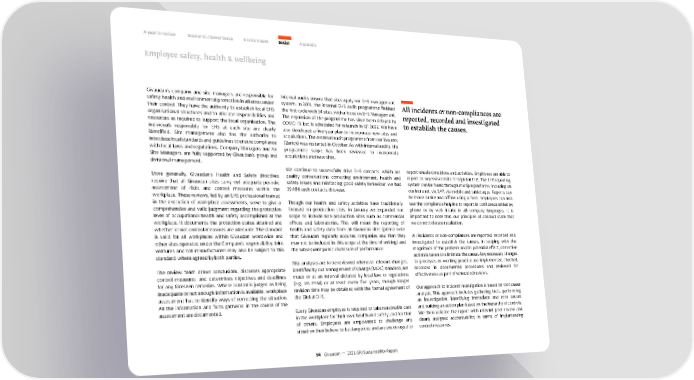 A year in review Economic / Governance Environment Social Appendix Employee safety, health & wellbeing Givaudan’s company and site managers are responsible for Internal audits ensure that sites apply our EHS management safety, health and environmental protection in all areas under system. In 2019, the internal EHS audit programme finished All incidents or non-compliances are their control. They have the authority to establish local EHS the first cycle with 34 sites, with a focus on EHS Management. reported, recorded and investigated organisational structures and to allocate responsibilities and The expansion of the programme has since been delayed by to establish the causes. resources as required to support the local organisation. The COVID-19 but is scheduled for relaunch in Q1 2022. We have individuals responsible for EHS at each site are clearly also developed a five-year plan to incorporate new sites and identified. Site management also has the authority to acquisitions. The external audit programme from our insurers introduce local standards and guidelines to ensure compliance (Zurich) was restarted in October. As with internal audits, the with local laws and regulations. Company Managers and /or programme scope has been reviewed to incorporate Site Managers are fully supported by Givaudan’s group and acquisitions and new sites. divisional management. We continue to successfully drive EHS contacts, which are report unsafe conditions and activities. Employees are able to More generally, Givaudan’s Health and Safety directives quality conversations correcting environment, health and report to supervisors/site EHS/global EHS. The EHS reporting require that all Givaudan sites carry out adequate periodic safety issues and reinforcing good safety behaviour, we had system can be found through multiple platforms, including on assessment of risks and control measures within the 39,686 such contacts this year. our intranet, via SAP, via mobile and tablet apps. Reports can workplace. These reviews, led by an EHS professional trained be made online and offline using a form. Employees can also in the execution of workplace assessments, serve to give a Though our health and safety activities have traditionally use the compliance helpline to report in confidence either by comprehensive and valid judgment regarding the protection focused on production sites, in January we expanded our phone or by web intake in all company languages. It is level of occupational health and safety accomplished at the scope to include non-production sites such as commercial important to note that our principles of conduct state that workplace. It documents the protection status attained and offices and laboratories. This will mean the reporting of we do not tolerate retaliation. whether or not control measures are adequate. The standard health and safety data from all Givaudan sites (please note is valid for all workplaces within Givaudan worldwide and that Givaudan regularly acquires companies and that they All incidents or non-compliances are reported, recorded and other sites operated under the Company’s responsibility. Joint may not be included in this scope at the time of writing) and investigated to establish the causes. In keeping with the ventures and toll manufacturers may also be subject to this the subsequent public disclosure of performance. magnitude of the problem and its potential effect, corrective standard, where agreed by both parties. action is taken to eliminate the cause. Any necessary changes Risk analyses are to be reviewed whenever relevant changes, to processes or working practice are implemented, checked, The review team draws conclusions, discusses appropriate identified by our Management of Change (MOC) standard, are recorded in documented procedures and reviewed for control measures, and determines objectives and deadlines made or at an interval dictated by local law or regulations effectiveness as part of scheduled reviews. for any foreseen remedies. Where control is judged as being (e.g. US PSM) or at least every five years, though longer inadequate or not enough information is available, workplace revision time may be obtained with the formal agreement of Our approach to incident investigation is based on root cause assessment has to identify ways of correcting the situation. the Global EHS. analysis. This approach includes gathering facts, performing All the information and facts gathered in the course of the an investigation, identifying immediate and root causes assessment are documented. Every Givaudan employee is required to take reasonable care and building an action plan based on the hierarchy of controls. in the workplace for their own health and safety, and for that We then validate the report with relevant peer review and of others. Employees are empowered to challenge any clearly assigned accountability in terms of implementing situation they believe to be dangerous and are encouraged to control measures. 94 Givaudan — 2021 GRI Sustainability Report