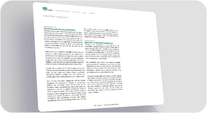 A year in review Economic / Governance Environment Social Appendix Stakeholder engagement Disclosure 102 – 42 size of groups; impact on our sustainability approach; risks Identifying and selecting stakeholders and benefits. Based on the outcome, we decide whether to Working systematically with interested parties and evaluating pursue a current engagement or seek opportunities with new their perspectives on economic, social, environmental, ethical organisations. We then suggest actions to be taken within the and governance issues helps us strengthen dialogue. It allows engagement for the next three years. us to better address their concerns and manage the direct or indirect impact on Givaudan. This approach can be used as a Disclosure 102 – 43 strategic management tool, it helps build stronger and lasting Approach to stakeholder engagement relationships with key stakeholders, allows us to manage our Listening to our stakeholders is a core element of our business successfully and also lays out the basis for our sustainability management practice. Their feedback helps us materiality assessment. understand expectations and it contributes to the development of our overall sustainability approach. We gather the views of When we set out to develop a materiality matrix in 2011, we our stakeholders by inviting them to discuss critical issues and carried out a wide-ranging assessment of our stakeholders to strategic priorities. We create dialogue groups to understand determine who had the greatest impact on us and on whom how our business affects stakeholders and to determine the we had the most effect. We identified seven key stakeholder most material impacts to be managed. groups from a list of more than 200 organisations: customers, suppliers, owners and investors, public and regulatory agencies, The sustainability aspects listed in the Givaudan materiality local communities, employees and innovators and partners. matrix are presented to stakeholders to allow them to confirm which they see as the most important topics, and which they Givaudan has developed specific tools to support interaction would like to discuss or know more about. The process gives with the various stakeholder panels at both global and local stakeholders a genuine role in setting the direction of our levels. We also review and evaluate diverse stakeholder sustainability approach and prioritising the issues. engagement initiatives existing across the Company and continuously monitor their relevance in a two-stage process. Ultimately, through stakeholder dialogue, we seek to identify opportunities to improve management and our relationships, First, we map each direct engagement with an external as well as create projects for our mutual benefit. This allows organisation by considering its relevance to several areas us to focus our drive for greater sustainability in those areas including our stakeholder groups; the key issues in our that are most important to our key stakeholders. Givaudan materiality matrix; our initiatives in sourcing, innovation and has many channels for stakeholder dialogue spread across environment, and the Sustainable Development Goals on different departments and teams; this also includes the which we have an impact. Then we look at every current or information and feedback we receive during the ordinary potential external engagement and assess it against several course of business. criteria: local or global engagement; membership criteria and membership fees; participating customers and suppliers; participating competitors; participant profiles; type of sessions; 13 Givaudan — 2021 GRI Sustainability Report