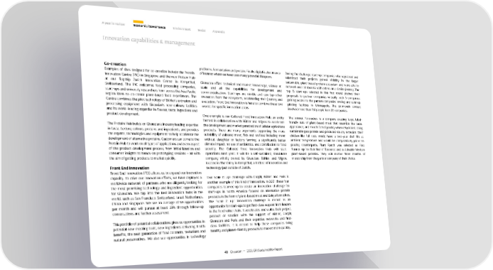 A year in review Economic / Governance Environment Social Appendix Innovation capabilities & management Co-creation platforms, fermentation and protein. Finally, digital is also an area During the challenge, start-up companies who registered and Examples of sites designed for co-creation include the Protein of interest where we have seen many potential disruptors. submitted their projects gained visibility in the larger Innovation Centre (PIC) in Singapore and the new Protein Hub sustainable, plant-based protein ecosystem and were able to at our flagship Zurich Innovation Centre in Kemptthal, Givaudan offers technical and market knowledge, science at network and collaborate with others on a similar journey. The Switzerland. The PIC welcomes food processing companies, scale and all the capabilities for development and top 15 start-ups selected in the first round pitched their start-ups and university researchers from across the Asia Pacific commercialisation. Start-ups are nimble and can tap other proposals to partner companies virtually, with 5 companies region keen to co-create plant-based food experiences. The resources from the ecosystem, accelerating their journey and gaining access to the partner companies’ testing and scale up Centre combines the pilot technology of Bühler’s extrusion and execution. Front End Innovation is here to combine these two piloting facilities in Minneapolis. The six-month contest processing equipment with Givaudan’s new culinary facilities worlds for specific innovation areas. involved more than 130 people from 22 companies. and its world-leading expertise in flavour, taste, ingredient and product development. One example is our Cultured Food Innovation Hub, an entity The winner, Nowadays, is a company creating large, label- formed in collaboration with Bühler and Migros to accelerate friendly cuts of plant-based meat that resemble the taste, The Protein Hub builds on Givaudan’s industry leading expertise the development and market penetration of cellular agriculture appearance, and mouth feel of poultry when rehydrated. Using in taste, texture, colours, proteins and ingredients, and provides products. There are many arguments supporting the mass sustainable pea protein and produced via dry extrusion, their the experts, technologies and equipment to help accelerate the suitability of cultured meat, fish and seafood including meat chicken-like full cuts would have a two-year shelf life at development of alternative proteins. Customers can come to the without slaughter or factory farming, a significantly better ambient temperature and would be comparatively priced to Protein Hub to work on all types of applications and every aspect climate impact, no use of antibiotics, and contribution to food poultry counterparts. Plant Ranch was selected as First of the product development process, from initial ideation and security. The Cultured Food Innovation Hub will start Runner-up for their line of flavoured and sustainable Mexican consumer insights to hands-on prototyping sessions – all with operations next year. It will be a self-sustained, standalone plant-based proteins. They will receive three months of the aim of getting products to market quickly. company wholly owned by Givaudan, Bühler, and Migros, mentorship from the partner company of their choice. located in The Valley in Kemptthal, a hotbed of innovation and Front End Innovation technology just outside of Zurich. Front End Innovation (FEI) allows us to expand our innovation capacity. To drive our innovation efforts, we have deployed a Our Scale It Up! challenge with Cargill, Bühler and Puris is worldwide network of partners who are diligently looking for another example of this kind of innovation. In 2021, these four the most promising technology and ingredient opportunities companies teamed up to create an innovation challenge for for Givaudan. We tap into the best innovation hubs in the start-ups in North America focused on alternative protein world, such as San Francisco, Switzerland, Israel, Netherlands, products in the form of plant-based meat and dairy alternatives. China and Singapore. We see an average of 50 opportunities The ‘Scale it up!’ innovation challenge is meant as an per month and will pursue at least 20% through follow-up opportunity for start-ups to get first-class support from leaders conversations and further assessment. in the food value chain. It accelerates and scales their project, product or solution with the support of Bühler, Cargill, This portfolio of potential collaborations gives us opportunities in Givaudan and Puris and their expertise, networks and first- potential new masking tools, new ingredients delivering health class facilities. It is meant to help these companies bring benefits, the next generation of food colorants, texturisers and healthy and planet-friendly products to market more quickly. natural preservatives. We also see opportunities in technology 43 Givaudan — 2021 GRI Sustainability Report