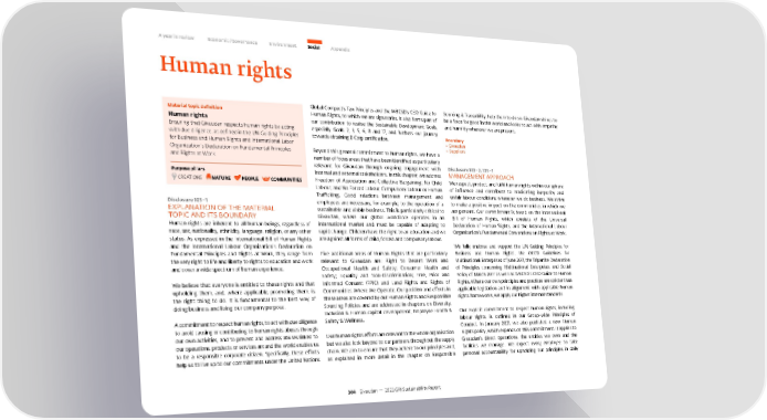 A year in review Economic / Governance Environment Social Appendix Human rights Global Compact’s Ten Principles and the WBCSD’s CEO Guide to Sourcing & Traceability, help them to do so. Givaudan strives to Material topic definition Human Rights, to which we are signatories. It also forms part of be a force for good in the world and looks to act with empathy Human rights our contribution to realise the Sustainable Development Goals, and humility wherever we are present. Ensuring that Givaudan respects human rights by acting especially Goals 2, 3, 5, 6, 8 and 17, and furthers our journey with due diligence, as defined in the UN Guiding Principles towards obtaining B Corp certification. Boundary for Business and Human Rights and International Labor • Givaudan Organization’s Declaration on Fundamental Principles Beyond this general commitment to human rights, we have a • Suppliers and Rights at Work. number of focus areas that have been identified as particularly relevant for Givaudan through ongoing engagement with Disclosure 103 – 2, 103 – 3 Purpose pillars internal and external stakeholders. In this chapter, we address MANAGEMENT APPROACH CREATIONS NATURE PEOPLE COMMUNITIES Freedom of Association and Collective Bargaining; No Child We respect, protect, and fulfil human rights within our sphere Labour, and No Forced Labour, Compulsory Labour or Human of influence and contribute to eradicating inequality and Trafficking. Good relations between management and unfair labour conditions wherever we do business. We strive Disclosure 103 – 1 employees are necessary, for example, to the operation of a to make a positive impact on the communities in which we EXPLANATION OF THE MATERIAL sustainable and viable business. This is particularly critical to are present. Our commitment is based on the International TOPIC AND ITS BOUNDARY Givaudan, where our global workforce operates in an Bill of Human Rights, which consists of the Universal Human rights are inherent to all human beings, regardless of international market and must be capable of adapting to Declaration of Human Rights, and the International Labour race, sex, nationality, ethnicity, language, religion, or any other rapid change. Children have the right to an education and we Organization’s Fundamental Conventions on Rights at Work. status. As expressed in the International Bill of Human Rights are against all forms of child, forced and compulsory labour. and the International Labour Organization’s Declaration on We fully endorse and support the UN Guiding Principles for Fundamental Principles and Rights at Work, they range from Five additional areas of Human Rights that are particularly Business and Human Rights, the OECD Guidelines for the very right to life and liberty to rights to education and work relevant to Givaudan are: Right to Decent Work and Multinational Enterprises of June 2011, the Tripartite Declaration and cover a wide spectrum of human experience. Occupational Health and Safety; Consumer Health and of Principles concerning Multinational Enterprises and Social Safety; Equality and Non-Discrimination; Free, Prior and Policy of March 2017 as well as WBCSD’s CEO Guide to Human We believe that everyone is entitled to these rights and that Informed Consent (FPIC) and Land Rights and Rights of Rights. Where our own principles and practices are stricter than upholding them, and, where applicable, promoting them, is Communities Where We Operate. Our position and efforts in applicable legislation and in alignment with applicable human the right thing to do. It is fundamental to the best way of these areas are covered by our Human Rights and Responsible rights frameworks, we apply our higher internal standards. doing business and living our company purpose. Sourcing Policies and are addressed in chapters on Diversity, Inclusion & Human capital development, Employee Health & Our explicit commitment to respect human rights, including A commitment to respect human rights, to act with due diligence Safety & Wellness. labour rights, is outlined in our Group-wide Principles of to avoid causing or contributing to human rights abuses through Conduct. In January 2021, we also published a new Human our own activities, and to prevent and address abuses linked to Our human rights efforts are relevant to the whole organisation Rights policy, which expands on this commitment. It applies to our operations, products or services around the world enables us but we also look beyond to our partners throughout the supply Givaudan’s direct operations, the entities we own and the to be a responsible corporate citizen. Specifically, these efforts chain. We aim to ensure that they adhere to our principles and, facilities we manage. We expect every employee to take help us to live up to our commitments under the United Nations as explained in more detail in the chapter on Responsible personal accountability for upholding our principles in daily 104 Givaudan — 2021 GRI Sustainability Report