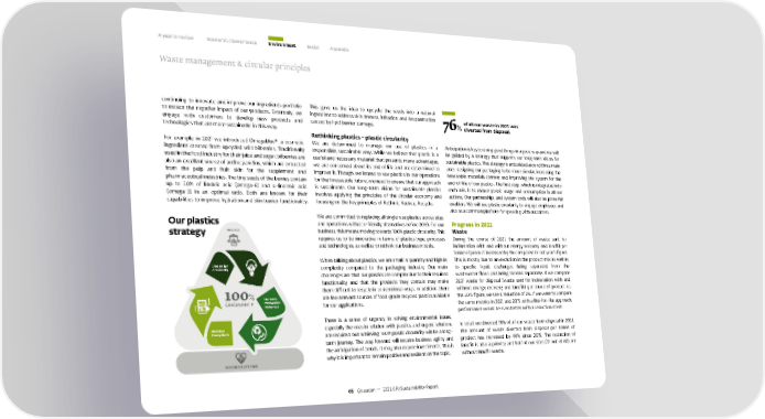 A year in review Economic / Governance Environment Social Appendix Waste management & circular principles continuing to innovate and improve our ingredients portfolio This gave us the idea to upcycle the seeds into a natural to reduce the negative impact of our products. Externally, we ingredient to address skin dryness, irritation, and desquamation of all our waste in 2021 was engage with customers to develop new products and caused by lipid barrier damage. 76% diverted from disposal. technologies that are more sustainable in this way. Rethinking plastics – plastic circularity For example, in 2021 we introduced Omegablue®, a cosmetic We are determined to manage our use of plastics in a Anticipation is key to doing good things in a good way and we will ingredient created from upcycled wild bilberries. Traditionally responsible, sustainable way. While we believe that plastic is a be guided by a strategy that supports our long-term vision for used in the food industry for their juice and sugar, bilberries are useful and necessary material that presents many advantages, sustainable plastics. This strategy is articulated around three main also an excellent source of anthocyanidins, which are extracted we are concerned about its end of life and are determined to axes: designing our packaging to be more circular, increasing the from the pulp and fruit skin for the supplement and improve it. Though we intend to use plastics in our operations renewable materials content and improving the system for the pharmaceutical industries. The tiny seeds of the berries contain for the foreseeable future, we need to ensure that our approach end-of-life of our plastics. The first step, which is integrated into up to 20% of linoleic acid (omega-6) and α-linolenic acid is sustainable. Our long-term vision for sustainable plastics each axis, is to reduce plastic usage and consumption in all our (omega-3) in an optimal ratio. Both are known for their involves applying the principles of the circular economy and actions. Our partnerships and system tools will also be powerful capabilities to improve hydration and skin barrier functionality. focusing on the key principles of Rethink, Reduce, Recycle. enablers. We will use plastic circularity to engage employees and also as a common platform for speaking with customers. Our plastics We are committed to replacing all single-use plastics across sites and operations with eco-friendly alternatives before 2030. For our Progress in 2021 strategy REDUCE business, this means moving towards 100% plastic circularity. This Waste requires us to be innovative in terms of plastics type, processes During the course of 2021, the amount of waste sent for and technologies, as well as to rethink our business models. incineration with and without energy recovery and landfill per tonne of product increased by 9% compared to last year’s figure. When talking about plastics, we are small in quantity and high in This is mostly due to an evolution in the product mix as well as Design for complexity compared to the packaging industry. Our main to specific liquid discharges being separated from the circularity challenges are that our plastics are complex due to their required wastewater flows and being treated separately. If we compare functionality and that the products they contain may make 2021 waste for disposal (waste sent for incineration with and 100% them difficult to recycle in conventional ways. In addition, there without energy recovery and landfill) per tonne of product vs. Increase are few relevant sources of food-grade recycled plastics available the 2015 figure, we see a reduction of 2%. If we were to compare CIRCULARITY renewable materials for our applications. the same metrics in 2021 and 2015 with a like-for-like approach, performance would be even better with a reduction of 6%. There is a sense of urgency in solving environmental issues, Improve especially the ones in relation with plastics, and urgent solutions In total, we diverted 76% of all our waste from disposal in 2021. the system are required, but achieving 100% plastic circularity will be a long- The amount of waste diverted from disposal per tonne of term journey. The way forward will require business agility and product has increased by 44% since 2015. The reduction of the anticipation of trends. It may also require investments. This is landfill is also a priority and half of our sites (31 out of 62) are why it is important to remain positive and resilient on the topic. without landfill waste. PARTNER & SYSTEMS 65 Givaudan — 2021 GRI Sustainability Report