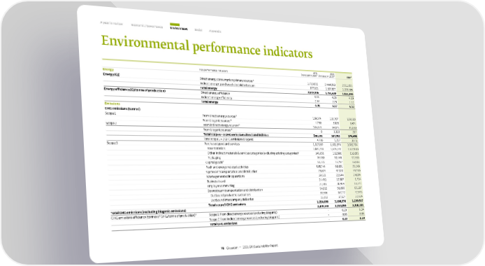 A year in review Economic / Governance Environment Social Appendix Environmental performance indicators 2015 2020 Key performance indicators (restated in 2021) ¹ (restated in 2021) ² 2021 ³ Energy Energy (GJ) Direct energy consumption primary sources ⁴ 1,710,865 2,444,093 2,511,855 Indirect energy: purchased electricity & steam 977,021 1,307,527 1,299,385 Total energy 2,687,886 3,751,620 3,811,240 Energy efficiency (GJ/tonne of production) Direct energy efficiency 4.44 4.28 4.30 Indirect energy efficiency 2.54 2.29 2.22 Total energy 6.98 6.57 6.52 Emissions GHG emissions (tonnes) Scope 1 From direct energy sources ⁵ 139,374 133,707 139,608 From biogenic sources ⁶ 4,700 3,925 3,574 Scope 2 From indirect energy sources ⁵ 106,879 54,075 31,090 From biogenic sources ⁶ 0 1,333 397 Total scope 1 + 2 GHG emissions direct and indirect 246,253 187,782 170,698 Total scope 1 + 2 GHG emissions biogenic 4,700 5,257 3,971 Scope 3 Purchased good and services 1,917,037 1,901,374 1,902,794 Raw materials 1,691,701 1,676,242 1,677,400 Other Indirect materials & services categories (excluding existing categories) ⁷ 146,856 132,686 133,055 Packaging 78,480 92,446 92,339 Capital goods ⁷ 51,722 72,797 56,003 Fuel- and energy-related activities 105,744 68,001 36,349 Upstream transportation and distribution 29,674 42,320 39,990 Waste generated in operations 19,321 22,644 24,084 Business travel 24,461 12,587 1,794 Employee commuting 21,516 20,454 13,277 Downstream transportation and distribution 54,615 56,099 65,297 Outbound product to customers 39,503 38,172 42,343 Outbound intercompany deliveries 15,112 17,927 22,954 Total scope 3 GHG emissions 2,224,090 2,196,276 2,139,587 Total GHG emissions (excluding biogenic emissions) 2,470,343 2,384,058 2,310,285 GHG emissions efficiency(tonnes of GHG/tonne of production)⁸ Scope 1: from direct energy sources (excluding biogenic) – 0.23 0.24 Scope 2: from indirect energy sources (excluding biogenic) – 0.09 0.05 Total GHG emissions – 0.33 0.29 78 Givaudan — 2021 GRI Sustainability Report