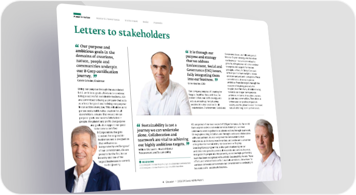 A year in review Economic / Governance Environment Social Appendix Letters to stakeholders Our purpose and It is through our Governance issues are fully integrated ambitious goals in the purpose and strategy into our 5-year strategy and therefore domains of creations, that we address our business – we are committed to growth, with purpose. We also continue nature, people and Environment, Social and to express our support for the ten communities underpin Governance (ESG) issues, principles of the UN Global Compact with respect to human rights, labour, our B Corp certification fully integrating them environment and anti-corruption. These journey. into our business. commitments allow us to pursue Calvin Grieder, Chairman Gilles Andrier, CEO ambitious financial targets through the creation of inspiring products for happier, healthier lives, all while moving Living our purpose through the associated Our company purpose of ‘creating for towards our longer-term purpose bold, ambitious goals allows us to continue happier, healthier lives with love for ambitions in terms of creations, nature, being a successful, sustainable business. We nature’ drives our 2025 strategy and people and communities. They allow us are committed to being a company that acts acts as a roadmap for delivering to increase our positive impact on as a force for good and to living our purpose sustainable value creation for all society and the planet in order to ensure in our actions every day. This will allow us to stakeholders. Environment, Social and sustainable long-term performance. pursue sustainable value creation for all stakeholders, ensure that we act on our purpose goals and successfully balance people, the planet and profit. Our purpose and goals also support our quest Sustainability is not a We are proud of our track record of ESG performance. As the world to become a certified journey we can undertake faces urgent societal and environmental challenges, we must B Corporation, the gold continue to work together to accelerate action; through teamwork, standard for responsible alone. Collaboration and through pioneering initiatives and through continued collaboration businesses and a designation teamwork are vital to achieving with our partners. In 2021 we joined the Renewable Carbon that will serve as our highly ambitious targets. Initiative as an Advisory board member, and we became a member independently verified proof of Together for Sustainability. We launched our flagship of our commitment. We are Willem Mutsaerts, Head of Global Sourcing4Good programme; a vital part of delivering on our proud to be the first in our Procurement and Sustainability ambition to responsibly source all materials and services in a way industry and one of the that protects people and the planet by 2030. Our high-performing largest businesses to commit READ MORE team has been recognised with a World Sustainability Award. These to this journey. 2021 Integrated Annual Report ▸page 10 ▸ Chairman’s introduction efforts and achievements reflect our bold ambitions, show how far we have come and demonstrate our commitment to continuing to 2021 Integrated Annual Report ▸page 12 ▸CEO interview be a successful, sustainable business. 4 Givaudan — 2021 GRI Sustainability Report