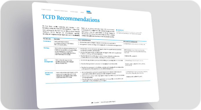 A year in review Economic / Governance Environment Social Appendix TCFD Recommendations We have been carefully considering and managing – with Report, we are already addressing many of the recommended DOWNLOAD increasing scrutiny since the 2015 Paris Agreement – many of the disclosures by TCFD. Alignment is also achieved through our yearly Our CDP questionnaires are found on givaudan.com ▸ investors ▸ ESG ▸ topics addressed by the Task Force on Climate-related Financial submissions of the CDP questionnaire on Climate Change, as CDP report on climate change and CDP report on water security Disclosures (TCFD). Through our comprehensive reporting, shown in the table below. We are increasing our efforts to further including our Integrated Annual Report and our GRI Sustainability enhance the quality and robustness of our analysis and reporting. Thematic area Description Recommended disclosures CDP questionnaire references 2021 Governance Disclose the organization’s a. Describe the board’s oversight of climate-related risks and opportunities. Climate change: C1.1a, C1.1b, C1.2, C1.2a, C1.3a governance around climate-related b. Management's role in assessing and managing climate related risks and opportunities risks and opportunities. Strategy Disclose the actual and potential impacts a. Describe the climate-related risks and opportunities the organization has identified Climate change: C2.1a, C2.2a, C2.3, C2.3a, C2.4, of climate-related risks and opportunities over the short, medium, and long term. C2.4a, C3.1, C3.1b, C3.1d, C3.1e, C3.1f, C3.2, C3.2a, on the organization’s businesses, b. D escribe the impact of climate-related risks and opportunities on the organization’s C3.3, C3.4 strategy, and financial planning where businesses, strategy, and financial planning. such information is material. c. Describe the resilience of the organization’s strategy, taking into consideration Water security: section W4 different climate-related scenarios, including a 2°C or lower scenario. Risk Disclose how the organization a. Describe the organization’s processes for identifying and assessing climate-related risks. Climate change: C2.1, C2.1a, C2.2, C2.2a Management identifies, assesses, and manages climate-related risks. b. Describe the organization’s processes for managing climate-related risks. Water security: section W3.3, W3.3a, W3.3b, W3.3c, W3.3d c. Describe how processes for identifying, assessing, and managing climate-related risks are integrated into the organization’s overall risk management. Metrics and Disclose the metrics and targets used to a. Disclose the metrics used by the organization to assess climate-related risks and Climate change: C2.1a, C2.1b, C2.3a, C2.4a, C4.1, Targets assess and manage relevant climate opportunities in line with its strategy and risk management process. C4.1a, C4.2, C4.2a, C6.1, C6.3, C6.5, C9.1 related risks and opportunities where b. Disclose Scope 1, Scope 2 and, if appropriate, Scope 3 greenhouse gas (GHG) emissions such information is material. and the related risks. Water security: section W4.1a, W8 c. Describe the targets used by the organization to manage climate-related risks and opportunities and performance against targets. 128 Givaudan — 2021 GRI Sustainability Report