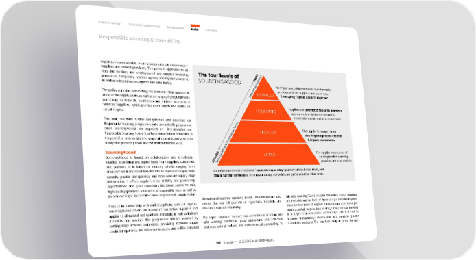 A year in review Economic / Governance Environment Social Appendix Responsible sourcing & traceability suppliers of raw materials, intermediate materials, intermediary suppliers and service providers. The policy is applicable to all h e sites and workers and employees of any supplier (including The four levels of ept nc a i permanent, temporary, contract agency and migrant workers), SOURCING4GOOD D l as well as subcontractors, agents and subsidiaries. omp We implement collaborative and transformative c ond activities with our suppliers and customers. The policy contains overarching requirements that apply to all y ADVANCED Developing flagship projects together. Be areas of the supply chain, as well as some specific requirements pertaining to Naturals, Synthetics and Indirect Materials & Services Suppliers, which provide more depth and clarity on COMMITTED Suppliers are committed to our RS practices certain topics. and we work with them to secure the essential materials and services we need. This year, we have further strengthened and expanded our Responsible Sourcing programme into an umbrella programme ocus f called Sourcing4Good, our approach to implementing our e The supplier is engaged in our Responsible Sourcing Policy. It reflects our ambition to become B anc ENGAGED due diligence process and risk Corp certified and our desire to source all materials and services in pli & impact assessment. om a way that protects people and the environment by 2030. c & ing Sourcing4Good th uild ACTIVE The supplier made aware of Sourcing4Good is based on collaboration and knowledge- d b our responsible sourcing rea ust sharing, experience and expert input from suppliers, customers B r practices and expectations. and partners. It is based on industry criteria ranging from T environmental and social benchmarks to improved supply chain Materials and services begin the "sourced responsibly" journey at the Active level, and security, greater transparency, and more relevant supply chain this is further embedded when assurance proof-points are gathered at the other levels. information. It offers suppliers more visibility and partnership opportunities and gives customers increased access to safe, high-quality products sourced in a responsible way, as well as greater oversight and detailed knowledge of their supply chains. through an integrated operating model. The ultimate aim is to this end, Sourcing4Good includes the status of our suppliers Created in partnership with multidisciplinary teams of experts, ensure that our full portfolio of ingredients, materials and and materials and the levels of rigour and partnerships in place. Sourcing4Good covers all 16,000 of our active suppliers and services is sourced responsibly. There are four levels of supplier status, ranging from those just applies to all natural and synthetic materials as well as indirect starting on their responsible sourcing journey to those involved materials and services. The programme will be powered by We expect suppliers to share our commitment to clean and in in-depth, transformational partnerships. This is meant to cutting-edge internal technology, providing increased supply safe working conditions, good agricultural and collection increase transparency, reduce risk and generate greater chain transparency and information access and will be delivered practices, animal welfare and environmental stewardship. To traceability and data. The four levels help us define the right 109 Givaudan — 2021 GRI Sustainability Report