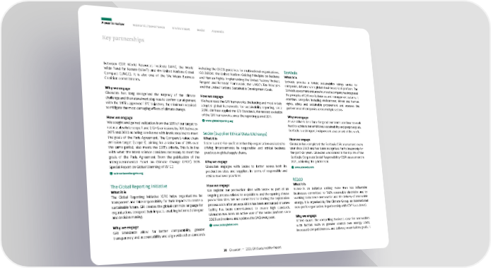 A year in review Economic / Governance Environment Social Appendix Key partnerships between CDP, World Resources Institute (WRI), the World including the OECD guidelines for multinational organisations; EcoVadis Wide Fund for Nature (WWF), and the United Nations Global ISO 26000; the United Nations Guiding Principles on Business What it is Compact (UNGC). It is also one of the We Mean Business and Human Rights: Implementing the United Nations ‘Protect, EcoVadis provides a holistic sustainability ratings service for Coalition commitments. Respect and Remedy’ Framework; the UNGC’s Ten Principles companies, delivered via a global cloud-based SaaS platform. The and the United Nations’ Sustainable Development Goals. EcoVadis assessment evaluates how well a company has integrated Why we engage the principles of CSR into its business and management systems. It Givaudan has long recognised the urgency of the climate How we engage examines categories including environment, labour and human challenge and the natural next step was to confirm our alignment We have used the GRI frameworks, the leading and most widely rights, ethics and sustainable procurement and assesses the with the SBTi’s approved 1.5°C trajectory, the minimum required adopted global frameworks for sustainability reporting, since performance of companies across multiple sectors. to mitigate the most damaging effects of climate change. 2010. We have applied the GRI Standards, the newest evolution of the GRI frameworks, since the reporting period 2017. Why we engage How we engage www.globalreporting.org As we strive to be a force for good, our teams continue to work We sought and gained validation from the SBTi of our target to hard to achieve our ambitious sustainability and purpose goals. reduce absolute scope 1 and 2 GHG emissions by 70% between EcoVadis is a stringent, independent assessment of this work. 2015 and 2030 as being consistent with levels required to meet Sedex (Supplier Ethical Data EXchange) the goals of the Paris Agreement. The Company’s value chain What it is How we engage emission target (scope 3), aiming for a reduction of 20% over Sedex is a not-for-profit membership organisation dedicated to Givaudan has completed the EcoVadis CSR assessment every the same period, also meets the SBTi’s criteria. This is in line driving improvements in responsible and ethical business year since 2008 and has been recognised for its leadership for with what the latest science considers necessary to meet the practices in global supply chains. the past six years. Givaudan was ranked in the top 5% of the goals of the Paris Agreement (from the publication of the EcoVadis Corporate Social Responsibility (CSR) assessment in Intergovernmental Panel on Climate Change (IPCC) 2018 Why we engage 2021, achieving the gold medal. Special Report on Global Warming of 1.5°C.) Givaudan engages with Sedex to better assess both its www.ecovadis.com sciencebasedtargets.org production sites and suppliers in terms of responsible and ethical business practices. RE100 The Global Reporting Initiative How we engage What it is What it is We register our production sites with Sedex as part of an RE100 is an initiative uniting more than 100 influential The Global Reporting Initiative (GRI) helps organisations be ongoing process related to acquisitions and the opening of new businesses committed to 100% renewable electricity and to transparent and take responsibility for their impacts to create a production sites. We are committed to starting the registration working to increase demand for and the delivery of renewable sustainable future. GRI creates the global common language for process soon after an acquisition has been announced or a new energy. It is organised by The Climate Group, an international organisations to report their impacts, enabling informed dialogue facility has been commissioned to ensure high standards. non-profit organisation, in partnership with CDP (see above). and decision making. Givaudan has been an active user of the Sedex platform since 2008 and reviews and updates the SAQ every year. Why we engage Why we engage www.sedexglobal.com RE100 shares the compelling business case for renewables GRI Standards allow for better comparability, greater with factors such as greater control over energy costs, transparency and accountability and align with other standards increased competitiveness, and delivery on emissions goals. It 20 Givaudan — 2021 GRI Sustainability Report