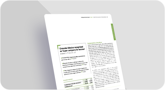 Equal pay certification As part of its commitment to being an inclusive and balanced employer, Givaudan obtained the equal pay certification in July 2021 for all sites in Switzerland. Compensation, a key driver Decent work and gender equality will be affected positively by ensuring equal pay for equal work. We monitor gender pay equity to identify any outstanding pay gaps and ensure they are promptly addressed. These annual global studies are conducted in our key markets and in accordance with the methodology of the Swiss Federal Office for Gender Equity. Results for the Givaudan Group globally show that the average base salary difference between men and women is 1.4% for equivalent roles and skill sets. For total cash compensation (fixed and variable pay) the difference is also 1.4%. In 2021, our sites in Switzerland received an equal pay certification, recognition as a fair employer. The Swiss Fair-ON-Pay certificate was received following a review by quality controller SGS, in accordance with the recognised statistical methods. In addition, our compensation policies are an essential component of our employee value proposition and a key driver of both individual and business performance. A robust process and continuously updated rewards strategy for employees is in place to ensure our compensation offering is competitive and enables us to attract, motivate and retain qualified employees. For our senior managers, our Performance Share Plan is fully aligned with the purpose ambitions for climate, diversity and inclusion, and employee safety. Thus performance is measured using financial key performance indicators as well as social and environmental targets. READ MORE For a more detailed explanation of our compensation mix ▸ page 129 ▸ Setting incentives to create value Givaudan employees 2021 2020 Total number of full-time employees ¹ 16,842 15,852 Total head count ² 14,128 12,807 Total number of employees (head count) 14,128 12,807 Women 5, 579 5,026 M en 8,549 7, 7 8 1 New employee hires 2,332 1,632 W omen 878 684 M en 1,454 948 Turnover rate 10% 9% W omen 10% 8% M en 10% 9% 1. This is defined as equivalent full-time employees and includes acquisitions ( Activ International, Vika B.V., Naturex, Centroflora, Expressions Parfumées, Albert-Vieille, Golden Frog, Ungerer, drom, Fragrance Oil, Alderys, DDW and Custom Essence). 2. Th is is defined as the number of physical people and includes internal temporary and regular employees. In 2020 it includes Activ International and all other acquisitions excluded. In 2021 it includes Activ International and drom integrated entities and all other acquisitions excluded. Givaudan Mexico recognised as ‘Super company for women’ RANKED 13 TH OUT OF 100 I feel safe here. Gender equality is promoted as part of our culture. Daniela Givaudan has been evolving to achieve the diversity and inclusion that it has and to ensure that everyone has a voice that can be heard. Enrique This Company is unique because it inspires me; I can be who I am within a place that gives me infinite options to create, inspire and learn. Paulina Givaudan – 2021 Integrated Annual Report Acting as a force for good Pe ople To wards a more balanced, inclusive company 95 Acting as a force for good