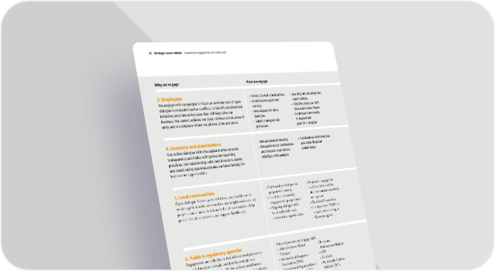 Why we engage How we engage 3. Employees We engage with our people to foster an environment of open dialogue to mutually resolve conflicts, to identify development initiatives and innovative ideas that will help drive our business. We cannot achieve our goals without a true sense of unity and a workplace where we all love to be and grow. • Works Council consultations • Employee engagement surveys • Annual performance dialogue • Talent management processes • Learning and development opportunities • Ongoing dialogue with Givaudan Green Teams • Employee community management platform, Imagine 4. Investors and shareholders Our active dialogue with the capital market ensures transparency and helps us improve our reporting practices. Our relationship with debt investors, banks and credit rating agencies ensures we have funding for investment opportunities. 5. Local communities Open dialogue fosters good relations, and enables us to work together with communities and neighbourhoods on projects and causes that benefit local communities, help protect local ecosystems and support livelihoods. 6. Public & regulatory agencies Engagement and collective action with external partners is essential in order to inspire and lead by example as a responsible business. Only collective action can influence decisions. We engage with local governments and regulators to understand the changes, their concerns and find mutually beneficial solutions. 7. Innovators and partners We engage in innovative partnerships to go beyond our own internal capabilities and seek out the extended possibilities and opportunities that collaboration can bring. This allows us to access the latest trends in innovation, to extend our innovation ecosystem to the global level and to accelerate our efforts in this domain. • Annual General Meeting • Annual investor conferences and investor road shows • Briefings with analysts • Conferences with investors and other financial stakeholders • Community development programme surveys • Local site community engagement programmes • Ongoing dialogue with local authorities and community organisations • Employees engaged in social activities within the communities in which we operate • Givaudan Foundation • Local partners (NGOs or cooperatives) acting as Givaudan agents Selected partners we engage with: • United Nations Global Compact • International Fragrance Association (IFRA) • International Organization of the Flavor Industry (IOFI) • WBCSD • AIM-PROGRESS • B Lab and B Movement Builders • CDP • EcoVadis • Renewable Carbon Initiative (RCI) • Together for Sustainability (TfS) • Global network of accelerators and incubators • Partnerships with innovators, accelerators and with academia • Plugged into disruptive and digital trends • Co-creation and co-innovation opportunities Givaudan – 2021 Integrated Annual Report 34 Strategic value creation St akeholder engagement and materiality
