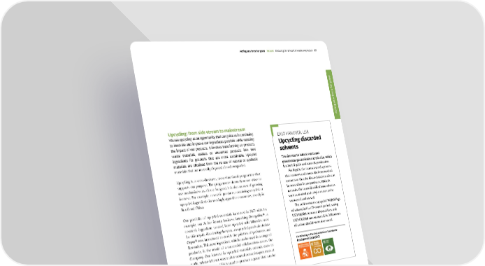 Upcycling: from side stream to mainstream We see upcycling as an opportunity that can guide us in continuing to innovate and improve our ingredients portfolio while reducing the impact of our products. It involves transforming co-products, waste materials, useless or unwanted products into new ingredients for products that are more sustainable. Upcycled materials are obtained from the re-use of natural or synthetic materials that are normally disposed of or downgraded. Upcycling is a cross-business, cross-functional programme that supports our purpose. The programme shows how we strive to use our business as a force for good. It is also an area of growing interest. For example, cosmetic products containing recycled or upcycled ingredients increasingly appeal to consumers, mostly in Brazil and China. Our portfolio of upcycled materials increased in 2021 with for example, our Active Beauty business launching Omegablue®, a cosmetic ingredient created from upcycled wild bilberries used for skin repair. Also during the year, an upcycled peach alcoholate Orpur® was introduced to enrich the palettes of perfumers and flavourists. This new ingredient, which can be used in a range of products, is the result of a successful collaboration across the Company. Our interest in upcycled materials extends even to garlic, where leftover waste after normal extraction processes at our site in Chicago, USA is used to produce a paste that can be added to seasoning design. While upcycling is our action, ‘no waste by design’ is our motivation. It underlies our search to valorise side streams by considering, from the design, what a raw material can offer in full. An example of how we consider the full circle is the harvesting of vetiver, the roots of which are predominantly used to craft a vetiver oil for fragrance. From the exhausted vetiver roots, the by-product of the extraction procedure, our Active Beauty team makes Vetivyne™ using water-soluble extraction techniques. In addition, through our long-standing involvement in the supply chain in Haiti, where vetiver mainly originates, applying the principle of ‘no waste by design’ has supported a local cooperative of vetiver root producers and established a programme to ensure the social and environmental responsibility of vetiver production. The aim was to reduce waste and greenhouse gas emissions at this site, which has both liquids and naturals production. For liquids, the team created a process that recovers and reuses oils from washed extracts so that the discarded citrus oils can be reused for future products. While in naturals, the team identified how solvents such as alcohol and ethyl acetate can be recovered and reused. The achievements: upcycled 190,000 kgs of solvent/oil in a 12-month period, saving USD 30,000 on waste disposal fees and USD 616,000 on raw materials; 108 tonnes of carbon dioxide were also saved. Contributing to the United Nations Sustainable Development Goals (SDG) EAST HANOVER, USA Upcycling discarded solvents Givaudan ▸ 2021 Integrated Annual Report Acting as a force for good Nat ure Re ducing the amount of waste we produce 87 Acting as a force for good