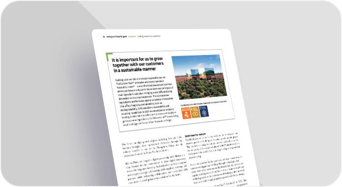 Our focus on high growth regions including Asia and Latin America brought about operational efficiencies through the volume transfer to our site in Changzhou, China, and the extension of our site in Pedro Escobedo, Mexico. Also in China, we forged a digital partnership with Alibaba – a step forward in our commitment to drive digital innovation across the fragrance industry. Such initiatives are key to expand and deepen strategic relationships with suppliers, start-ups and partners while enhancing collaboration and co-creation with customers to develop innovative solutions for the future. Throughout 2021 Fragrance & Beauty focussed on enhancing digital capabilities internally, through partnerships, and via acquisitions such as Myrissi. With the pandemic still top of mind, we developed new technologies to help mitigate its impacts: one example is our Active Beauty product Masknyl ™ , an active ingredient able to counteract the redness, inflammation and hyperpigmentation from mask wearing. It is important for us to grow together with our customers in a sustainable manner Guiding us in our bid to innovate responsibly are our FiveCarbon Path™ principles and newly launched Naturality Index™ – a one-of-a-kind assessment tool that allows perfumers to factor in the environmental impact of their ingredient selection, bringing a new differentiating dimension to the creative process. The tool assesses ingredients and formulas against a number of measures that affect fragrance sustainability, such as biodegradability, GHG emissions, renewability and sourcing. In addition, in 2021 we developed an industry- leading mobile lab that will travel to sources of supply to generate new ingredients: the Blossom Lab™ is now being used to design the future of our Naturals at Origin. Our science and technology capabilities provide a solid foundation to solve the most pertinent challenges. With love for nature Equally important to us is the work we do to improve our business practices for the good of nature, people and the planet. This extends to caring for animals, and one such milestone that we are proud of is our partnership with BASF which has led to the launch of the world’s first toxicology testing strategy without animal testing. Across our portfolio in the past year, we have found ways to expand existing product offerings through technologies that make them more environmentally friendly, but also address the rapidly evolving needs of our time – from consumer health and wellbeing needs to the environmental challenges that the world faces as a result of rapid population growth and climate change. One example is our PlanetCaps™ introduced in 2021. This industry-leading first-to-market fragrance encapsulation innovation enables a long-lasting fragrance experience in a biodegradable and bio-sourced delivery system for fabric softeners. We are the first fragrance house to offer a fully scaled solution ahead of the European Chemicals Agency’s proposed restriction on microplastics, due for ratification in 2022. The introduction of PlanetCaps™ allows our customers to solve the complex feasibility equation between greenness and performance in fabric softeners, a consumer goods application that is very reliant on capsules. Contributing to the United Nations Sustainable Development Goals (SDG) Givaudan – 2021 Integrated Annual Report 56 Acting as a force for good Cr eations Cr eating value for our customers