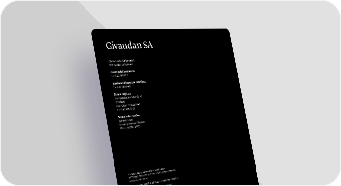2021 Integrated Annual Report Givaudan SA Chemin de la Parfumerie 5 1214 Vernier, Switzerland General information T + 41 22 780 91 11 Media and investor relations T + 41 22 780 90 53 Share registry Computershare Schweiz AG Postfach 4601 Olten, Switzerland T + 41 62 205 77 00 Share information Symbol: GIVN Security number: 1064593 ISIN: CH0010645932 Concept, design, consulting and realisation: PETRANIX Corporate and Financial Communications AG www.PETRANIX.com The 2021 Integrated Annual Report is published in English. All trademarks mentioned enjoy legal protection. Printed in Switzerland by Neidhart + Schön Print AG, www.nsgroup.ch This report may contain forward-looking information. Such information is subject to a variety of significant uncertainties, including scientific, business, economic and financial factors. Therefore actual results may differ significantly from those presented in such forward-looking statements. Investors must not rely on this information for investment decisions. Picture credits: Givaudan, Shutterstock, iStockphotos. © Givaudan SA, 2022 www.givaudan.com