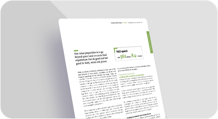 While we directly or indirectly contribute in many ways to the transformation of food systems, we believe we can be most impactful specifically in the following four areas: Firstly, we contribute to the shift towards more mindful and planet-friendly diets by offering more diverse food options and plant-based food experiences through our Plant Attitude portfolio. We also enable consumers to choose more nutritious food by improving the nutritional profile of our customers’ products – for example, by adding more essential nutrients and removing undesirable ingredients such as sugar, salt or fat. In addition, we help consumers achieve their wellbeing goals by offering products that deliver intuitive and clinically proven health benefits with our botanical extracts and bioactive ingredients. And we also drive responsible supply across the entire value chain through our Sourcing4Good programme. We recognise that a multi-stakeholder approach is essential. Our long-standing culture of collaboration and co-creation with customers and other partners, such as academia, start-ups, suppliers and others, enables us to innovate and develop ground- breaking solutions to drive positive change. Digitalisation for positive change Digitalisation is bringing many positive changes in the food and beverages sector. For example, artificial intelligence is pivotal in helping the industry to meet fast-evolving consumer demands. Digital tools have huge potential, from allowing us to engage more meaningfully with customers to gaining better consumer understanding and speeding up development processes and production. One example is Aroma Kiosk, launched in 2021. This ground- breaking new digital tool can be used in real-life environments such as grocery stores to gather valuable customer insights and recommend products in real time. Artificial intelligence uses the data gathered to improve product design in co-creation with customers. The Aroma Kiosk is a game changer that allows us Our ambition is to become the creative partner of choice not only in personal, fabric, hygiene and home care, but also in fine fragrance and beauty overall. to crowdsource information on consumer preferences quickly, across many different demographics. FRAGRANCE & BEAUTY Leading with creativity and passion In the past two years, our Fragrance & Beauty business has heard a resounding call for meaningful innovations that help our customers respond to consumers’ wishes – not just for improved physical experiences, but for tangible sensations that can uplift lives. As the creative leader in the fragrance industry, we synergistically bring together creativity and science to push industry limits. This requires us to keep our fingers on the pulse and stay abreast of rapidly evolving consumer preferences and industry trends. By combining our inventiveness and insights with the latest technologies, we continue to challenge ourselves to push boundaries and set the bar for the industry. We aim to be the partner of choice to work with our customers. Together, our vision inspires new and superior products that meet customers’ needs, are loved by consumers and are good for our planet. Pushing boundaries and raising the bar Throughout 2021, we delivered ground-breaking products in biotechnology, beauty, delivery systems and naturals, staying in tune with consumers’ needs. This was made possible by mergers and acquisitions, digitalisation, operational efficiencies and a people-first culture at a time when it mattered most. Our value proposition is to go beyond great taste to create food experiences that do good and feel good for body, mind and planet. R&D spend CHF 562 million , 8﹒4 % of sales Givaudan – 2021 Integrated Annual Report Acting as a force for good Cr eations Cr eating value for our customers 55 Acting as a force for good