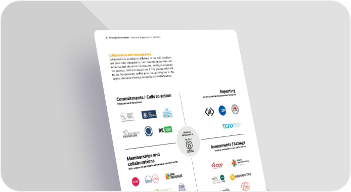 CEO WATER MANDATE Collaboration and transparency Collaboration is essential to delivering on our bold ambitions and promoting transparency. Our external partnerships and initiatives span the entire ESG spectrum, helping us accelerate our progress. Central to these is our B Corp journey which will be the independently verified proof we are living up to the highest standards of being a successful, sustainable business. Commitments / Calls to action What we want to achieve Memberships and collaborations With whom we partner to achieve our commitments Reporting How we communicate about our progress Assessments / Ratings External evaluation of our performance Working to become a Givaudan – 2021 Integrated Annual Report 36 Strategic value creation St akeholder engagement and materiality
