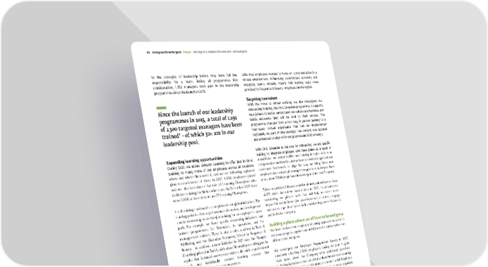 to the concepts of leadership before they have full line responsibility for a team. Taking all programmes into consideration, 1,292 managers took part in the leadership programmes since the launch in 2015. Expanding learning opportunities During 2021, we added LinkedIn Learning to offer ‘just-in-time’ training to many more of our employees across all locations when and where they need it, and we are following a phased plan to reach more of them. In 2021, 3,000 employees joined and we also introduced the role of Learning Champions who facilitate training for their entire team. By December 2021 there were 2,066 activated users and 71 Learning Champions. Local training continued to complement our global initiatives. The starting point is often a performance discussion, and development can be mentoring or on-the-job training for an employee’s career path. For example, we have specific mentoring initiatives and trainee programmes for flavourists, in operations, and for management trainees. There is also a sales academy in Taste & Wellbeing and the Givaudan Perfumery School in Fragrance & Beauty. In addition, a new initiative in 2021 was the ‘Sharpist Coaching’ piloted in Zurich, with about 10 employees taking part in a pilot that featured one-to-one video calls with a professional coach and individually curated learning content that complemented many of our programmes. Local efforts also provide customised initiatives. In India, for example, the human resource teams designed and introduced a training plan and calendar customised to the local employees. And in China, the local team ran workshops to help employees develop a growth mindset, which brought both personal and business benefits. As well as the workshops, employees were provided resources such as videos, audio books and live streams to apply a growth mindset around the topics including self- awareness, enhancing capacity and cultivating learning as a habit. Underlining the importance of equipping employees with skillsets to help them succeed in the changing environment, an ‘Upskilling Yourself’ programme was introduced by Fragrance & Beauty in Asia Pacific. A survey in the region identified three skills that employees wanted to focus on: communication in a virtual environment, influencing stakeholders remotely, and engaging teams virtually. Nearly 400 training seats were provided to Fragrance & Beauty employees in the region. Targeting new talent With the move to virtual working, we also redesigned our onboarding training, the ONE Givaudan programme. It supports new joiners to better understand our culture and business and builds networks that will be vital to their success. The programme changed from a two-day, in-person training to a four-week, virtual experience that can be implemented regionally. As part of this redesign, the content was updated and enhanced to align with our purpose and 2025 strategy. With ONE Givaudan as the core for onboarding, we add specific training to integrate employees who have joined as a result of acquisitions: we added toolkits and training in topics such as in compensation and benefits; and we have a consistent approach and structured framework to align the way we bring these new employees into our people management practices. In the past three years, about 3,500 people have been integrated into our Company. Talent acquisition followed a similar virtual path with more than 4,073 video interviews undertaken in 2021. In recruitment marketing, we piloted tools that will help us create more impactful and inclusive job advertisements to attract, engage and assess top talent faster, in line with being a more balanced and inclusive company. Building a place where we all love to be and grow We have evolved our employee listening approach in order to measure progress against our ambition to be a place where we all love to be and grow. We revamped our Employee Engagement Survey in 2021, randomly selecting 2,000 employees during the year to gain their views about the Company with additional questions including inclusion so we can obtain a benchmark for measuring progress in this ambition. We plan to conduct a full Employee Engagement Survey in 2022 and to hold them more regularly than the usual three-year interval. The 2021 sample survey results were generally positive and show we are moving in the right direction. Overall, we have a strong engagement and an increase across all areas. We are analysing the survey data and will share the results with employees, and will create initiatives for 2022 and beyond. Since the launch of our leadership programmes in 2015, a total of 1﹐292 of 2﹐300 targeted managers have been trained ¹ – of w hich 50 % are in our leadership pool. 1. This programme was piloted in late 2014 with 35 participants, and in 2021 we r edefined and focussed the scope of the targeted population. Givaudan fi 2021 Integrated Annual Report 90 Acting as a force for good Pe ople Wo rking for a company that does well – and does good