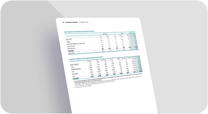 New employee ² hi res by age group, gender and region Age range Gender <30 30-50 >50 Women Men Tot al Asia Pacific 176 248 14 199 239 438 Europe 290 417 27 306 428 734 South Asia, Middle East and Africa 61 80 3 52 92 144 Latin America 216 274 10 179 321 500 North America 184 252 80 142 374 516 Total 2021 927 1,271 134 878 1,454 2,332 Total 2020 629 914 89 684 948 1,632 Employees ² c ategories and composition of governance bodies Women Men Asia Pacific Europe SAMEA Latin America North America Tot al Senior Leaders ³ 51 148 20 121 6 17 35 199 -in % 26% 74% 10% 61% 3% 9% 18% 100% Middle managers 1,967 1,941 918 1,578 318 436 658 3,908 -in % 50% 50% 23% 40% 8% 11% 17% 100% Associates 3,561 6,460 2,078 3,896 719 1,598 1,730 10,021 -in % 36% 64% 21% 39% 7% 16% 17% 100% Total 2021 5,579 8,549 3,016 5,595 1,043 2,051 2,423 14,128 1. This is defined as the equivalent full time employees and includes acquisitions (Activ International, Vika B.V ., Naturex, Centroflora, Expressions Parfumées, Albert-Vieille, Golden Frog, Ungerer, drom, Fragrance Oil, Alderys, DDW and Custom Essence). 2. This is defined as the number of physical people and includes internal temporary and regular employees. In 2020, it included Activ International but all other acquisitions excluded. In 2021, it includes Activ International and drom integrated entities, all other acquisitions are excluded. 3. In cluding the Executive Committee. Givaudan – 2021 Integrated Annual Report 146 Consolidated statements Co nsolidated ESG data