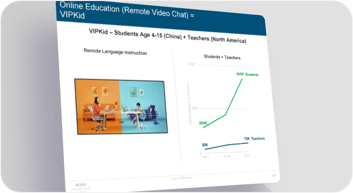 Online Education (Remote Video Chat) = VIPKid VIPKid – Students Age 4-15 (China) + Teachers (North America) Remote Language Instruction Students + Teachers 700K 600K Students s r he c ea T & ts en350K tud S d i K IP 200K V 70K Teachers 30K 0 2017 2018 2019 Source: VIPKid (3/19). Internet Trends 249 2019