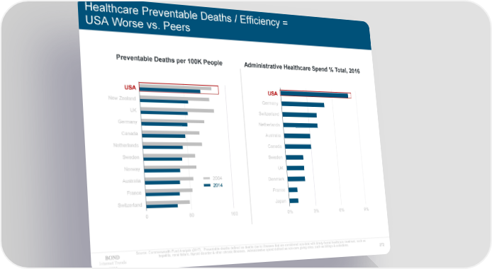 Healthcare Preventable Deaths / Efficiency = USA Worse vs. Peers Preventable Deaths per 100K People Administrative Healthcare Spend % Total, 2016 USA USA USA USA New Zealand Germany UK Switzerland Germany Netherlands Canada Australia Netherlands Canada Sweden Sweden Norway UK Australia 2004 Denmark 2014 France France Switzerland Japan 0 80 160 0% 3% 6% 9% Source: Commonwealth Fund Analysis (2017). Preventable deaths defined as deaths due to illnesses that are considered non-fatal with timely formal healthcare treatment, such as hepatitis, renal failure, thyroid disorder & other chronic illnesses. Administrative spend defined as non-care giving roles, such as billings & collections. Internet Trends 272 2019
