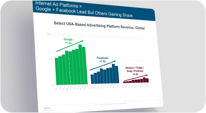 Internet Ad Platforms = Google + Facebook Lead But Others Gaining Share Select USA-Based Advertising Platform Revenue, Global $40B Google +1.4x $20B Facebook +1.9x Amazon / Twitter / Snap / Pinterest +2.6x $0 Source: Company public releases & Morgan Stanley estimates. Internet Trends 25 2019