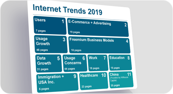 Internet Trends 2019 Users 1 E-Commerce + Advertising 2 7 pages 19 pages Usage 3 Freemium Business Models 4 Growth 46 pages 18 pages Data 5 Usage 6 Work 7 Education 8 Growth Concerns 31 pages 44 pages 18 pages 15 pages Immigration + 9 Healthcare 10 China 11 USA Inc. (Provided by Hillhouse Capital) 6 pages 23 pages 35 pages