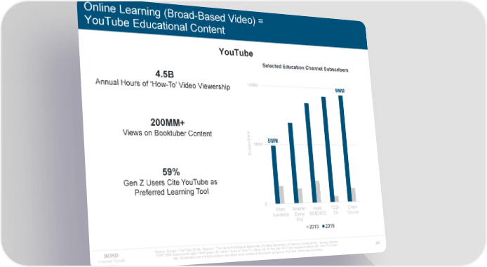 Online Learning (Broad-Based Video) = YouTube Educational Content YouTube Selected Education Channel Subscribers 4.5B Annual Hours of ‘How-To’ Video Viewership 10MM 9MM 200MM+ s Views on Booktuber Content r be i r 5MM c 5MM s ub S 59% Gen Z Users Cite YouTube as Preferred Learning Tool 0 Khan Smarter Asap TED- Crash Academy Every SCIENCE Ed Course Day 2013 2019 Source: Google / YouTube (5/19), Pearson / The Harris Poll Beyond Millennials: the Next Generation of Learners survey (8/18). Survey includes 2,587 USA respondents ages 14-40 years old. Note: Hours of ‘How-To’ videos are for the year 2017 and represent videos with ‘How-To’ in the Internet Trends title. Booktubers are content creators that share book reviews & discussion groups on YouTube. Views are cumulative. 251 2019
