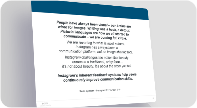 People have always been visual – our brains are wired for images. Writing was a hack, a detour. Pictorial languages are how we all started to communicate –we are coming full circle. We are reverting to what is most natural. Instagram has always been a communication platform, not an image sharing tool. Instagram challenges the notion that beauty comes in a traditional, artsy form… it’s not about beauty, it’s about the story you tell. Instagram’s inherent feedback systems help users continuously improve communication skills. Kevin Systrom – Instagram Co-Founder, 5/19 Internet Trends 86 2019
