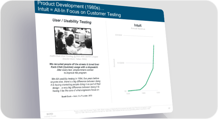 Product Development (1980s)… Intuit = All-In Focus on Customer Testing User / Usability Testing Intuit Annual Revenue $300MM Kwik-Chek User Testing @ Palo Alto Junior League (Inside Intuit, Taken 1984) ue We recruited people off the streets & timed their en $150MM Kwik-Chek (Quicken) usage with a stopwatch. Rev After every test, programmers worked to improve the program. We did usability testing in 1984, five years before anyone else, there’s a big difference between doing it & having marketing people doing it as part of their design…a very big difference between doing it & having it be the core of what engineers focus on. $0 Scott Cook – Intuit, Co-Founder, 9/03 1984 1989 1994 Source: Inside Intuit, Suzanne Taylor, 2003 Photo courtesy of Virginia Boyd as presented by Inside Intuit. Revenue as reported in ‘Inside Intuit’ for 1988-1990 & as reported to the SEC for 1993/1994. Intuit released its first revenue-generating product, Kwik-Chek in 1984. Internet Trends 127 2019