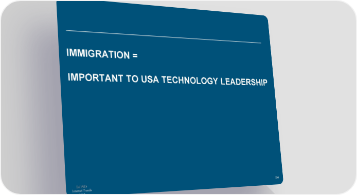 IMMIGRATION = IMPORTANT TO USA TECHNOLOGY LEADERSHIP Internet Trends 259 2019 Internet Trends - Mary Meeker Page 258 Page 260Video Player is loading.Play VideoPlaySkip BackwardSkip ForwardMuteCurrent Time 0:00/Duration -:-Loaded: 0%0:00Stream Type LIVESeek to live, currently behind liveLIVERemaining Time --:- 1xPlayback RateChaptersChaptersDescriptionsdescriptions off, selectedCaptionscaptions settings, opens captions settings dialogcaptions off, selectedAudio TrackPicture-in-PictureFullscreenThis is a modal window.The media could not be loaded, either because the server or network failed or because the format is not supported.Beginning of dialog window. Escape will cancel and close the window.TextColorWhiteBlackRedGreenBlueYellowMagentaCyanOpacityOpaqueSemi-TransparentText BackgroundColorBlackWhiteRedGreenBlueYellowMagentaCyanOpacityOpaqueSemi-TransparentTransparentCaption Area BackgroundColorBlackWhiteRedGreenBlueYellowMagentaCyanOpacityTransparentSemi-TransparentOpaqueFont Size50%75%100%125%150%175%200%300%400%Text Edge StyleNoneRaisedDepressedUniformDrop shadowFont FamilyProportional Sans-SerifMonospace Sans-SerifProportional SerifMonospace SerifCasualScriptSmall CapsResetDoneClose Modal DialogEnd of dialog window.