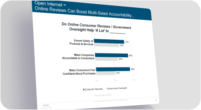 Open Internet = Online Reviews Can Boost Multi-Sided Accountability… Do Online Consumer Reviews / Government Oversight Help ‘A Lot’ to _________ Ensure Safety of 41% Ensure Safety of Products / Services Products & Services 33% Make Companies 45% Make Companies Accountable to Consumers Accountable to Consumers 30% Make Consumers Feel 46% Make Consumers Feel Confident About Purchases 25% Confident About Purchases 0% 25% 50% Consumer Reviews Government Oversight Pew Survey (USA) Source: Pew Research Survey (12/15). N = 4,787 USA Consumers. Internet Trends 195 2019
