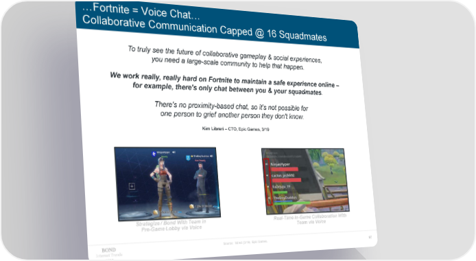 …Fortnite = Voice Chat… Collaborative Communication Capped @ 16 Squadmates To truly see the future of collaborative gameplay & social experiences, you need a large-scale community to help that happen. We work really, really hard on Fortnite to maintain a safe experience online – for example, there's only chat between you & your squadmates. There's no proximity-based chat, so it's not possible for one person to grief another person they don't know. Kim Libreri – CTO, Epic Games, 3/19 Strategize / Bond With Team in Real-Time In-Game Collaboration With Pre-Game Lobby via Voice Team via Voice Source: Wired (3/19). Epic Games. Internet Trends 97 2019
