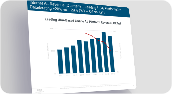 Internet Ad Revenue (Quarterly – Leading USA Platforms) = Decelerating +20% vs. +29% (Y/Y – Q1 vs. Q4) Leading USA-Based Online Ad Platform Revenue, Global $60B 40% ) ne ar) Li B Red ue l ( B $30B 20% th ( ue ow en r G Rev /Y Y $0 0% Q1:17 Q2:17 Q3:17 Q4:17 Q1:18 Q2:18 Q3:18 Q4:18 Q1:19 Source: Company public releases & Morgan Stanley estimates. Note: Includes Google / Facebook / Twitter / Amazon / Snapchat / Pinterest. Internet Trends 24 2019