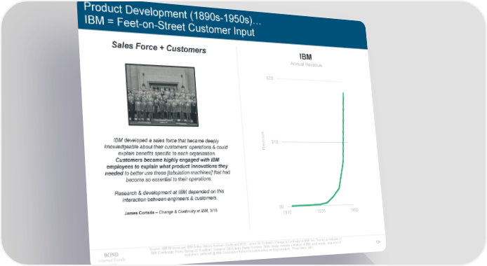 Product Development (1890s-1950s)… IBM = Feet-on-Street Customer Input Sales Force + Customers IBM Annual Revenue $2B ue IBM developed a sales force that became deeply en $1B knowledgeable about their customers’ operations & could Rev explain benefits specific to each organization. Customers became highly engaged with IBM employees to explain what product innovations they needed to better use these [tabulation machines] that had become so essential to their operations. Research & development at IBM depended on this interaction between engineers & customers. James Cortada – Change & Continuity at IBM, 3/18 $0 1910 1935 1960 Source: IBM Revenue per IBM Online History Archives (Collected 2019). James W. Cortada’s ‘Change & Continuity’ at IBM: Key Themes in Histories of IBM (Cambridge Press, Spring 2018 edition). Cimarron City Library Digital Archives. Note: Image contains a mixture of IBM sales people, engineers & Internet Trends customers gathered @ IBM Corporation School for collaborative working sessions. Photo taken 1951. 124 2019