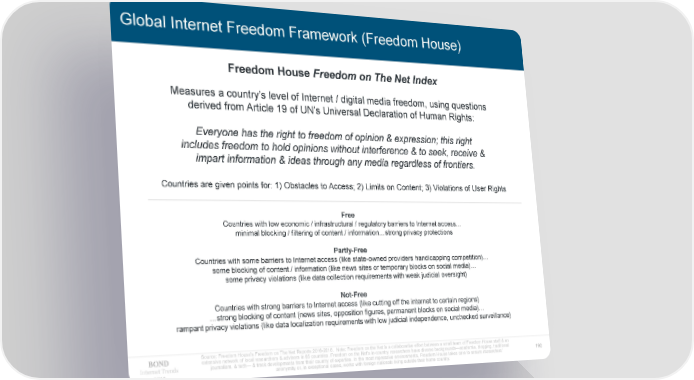 Global Internet Freedom Framework (Freedom House) Freedom House Freedom on The Net Index Measures a country’s level of Internet / digital media freedom, using questions derived from Article 19 of UN’s Universal Declaration of Human Rights: Everyone has the right to freedom of opinion & expression; this right includes freedom to hold opinions without interference & to seek, receive & impart information & ideas through any media regardless of frontiers. Countries are given points for: 1) Obstacles to Access; 2) Limits on Content; 3) Violations of User Rights Free Countries with low economic / infrastructural / regulatory barriers to Internet access… minimal blocking / filtering of content / information…strong privacy protections Partly-Free Countries with some barriers to Internet access (like state-owned providers handicapping competition)… some blocking of content / information (like news sites or temporary blocks on social media)… some privacy violations (like data collection requirements with weak judicial oversight) Not-Free Countries with strong barriers to Internet access (like cutting off the internet to certain regions) …strong blocking of content (news sites, opposition figures, permanent blocks on social media)… rampant privacy violations (like data localization requirements with low judicial independence, unchecked surveillance) Source: Freedom House’s Freedom on The Net Reports 2016-2018. Note: Freedom on the Net is a collaborative effort between a small team of Freedom House staff & an extensive network of local researchers & advisors in 65 countries. Freedom on the Net’s in-country researchers have diverse backgrounds—academia, blogging, traditional Internet Trends journalism, & tech— & track developments from their country of expertise. In the most repressive environments, Freedom House takes care to ensure researchers’ 190 2019 anonymity or, in exceptional cases, works with foreign nationals living outside their home country.