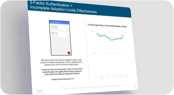 2-Factor Authentication = Incomplete Adoption Limits Effectiveness % Sites Supporting 2-Factor Authentication, Global* 60% 54% 52% 30% Security experts have seen a significant uptick in the number of clients securing their VPN or remote access infrastructure with multi-factor authentication. However, there is frequently a lack of multi-factor authentication for applications being accessed from within the internal corporate network. 0% FireEye Threat Research, 4/19 2014 2015 2016 2017 2018 Source: Elie Bursztein (Security & Anti-Abuse Lead @ Google). analysis of dongleauth.info database data (12/18). FireEye (4/19) Internet Trends 209 2019