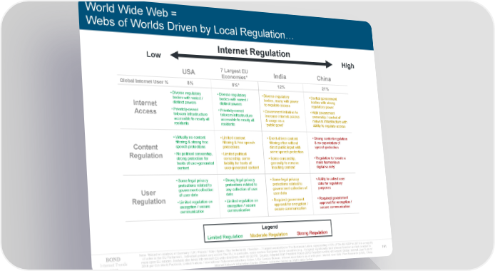 World Wide Web = Webs of Worlds Driven by Local Regulation… Internet Regulation High Low USA 7 Largest EU India China Economies* Global Internet User % 8% 8%* 12% 21% • Diverse regulatory • Diverse regulatory • Diverse regulatory • Central government bodies with varied / bodies with varied / bodies, many with power bodies with strong Internet distinct powers distinct powers to regulate access regulatory power Access • Privately-owned • Privately-owned • Government initiative to • High government telecom infrastructure telecom infrastructure increase Internet access ownership / control of accessible to nearly all accessible to nearly all & usage as a network infrastructure with residents residents ‘public good’ ability to regulate access • Virtually no content • Limited content • Event-driven content • Strong content regulation filtering & strong free filtering & free speech filtering often without & no expectation of Content speech protections protections direct public input with speech protection Regulation • No political censorship, • Limited political some speech protection strong protection for censorship, some • Some censorship, • Regulation to ‘create a hosts of user-generated liability for hosts of generally to remove more harmonious content user-generated content ‘insulting content’ digital society’ • Some legal privacy • Strong legal privacy • Some legal privacy • Ability to collect user protections related to protections related to protections related to data for regulatory User government collection any collection of user government collection of purposes Regulation of user data data user data • Limited regulation on • Limited regulation on • Required government • Required government encryption / secure encryption / secure approval for encryption / approval for encryption / communication communication secure communication secure communication Legend Limited Regulation Moderate Regulation Strong Regulation Note: *Based on analysis of Germany / UK / France / Italy / Spain / The Netherlands / Sweden – 7 largest economies in The European Union, representing >70% of The EU GDP in 2018 & a majority of votes in the EU Parliament…Individual policies vary across The EU, in particular, some eastern European Union countries (e.g., Hungary) significantly limit Internet freedom in stark contrast to Internet Trends more open EU nations. Analysis also takes into account EU-wide directives, such as GDPR. Source: Adapted from Freedom House 2018 Freedom on the Net Report. Global Internet User % as of 191 2019 2018 per CIA World Factbook, United Nations / International Telecommunications Union, USA Census Bureau. Internet user data is as of mid-year. Internet user data: Pew Research (USA), China Internet Network Information Center (China), estimates based on IAMAI data (India).