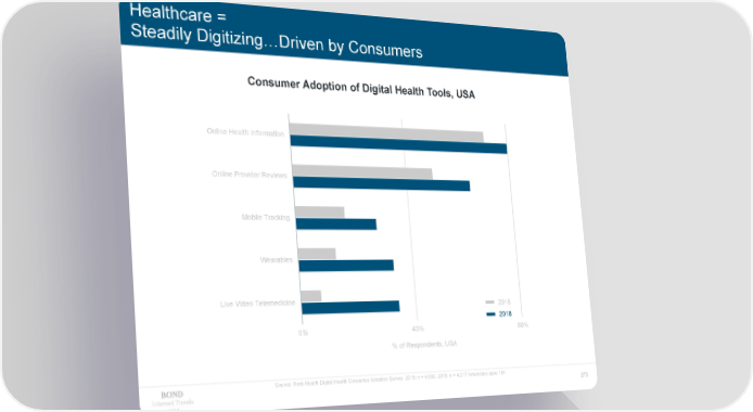 Healthcare = Steadily Digitizing…Driven by Consumers Consumer Adoption of Digital Health Tools, USA Online Health Information Online Provider Reviews Mobile Tracking Wearables Live Video Telemedicine 2015 2018 0% 40% 80% % of Respondents, USA Source: Rock Health Digital Health Consumer Adoption Survey. 2018: n = 4,000, 2015: n = 4,017 Americans ages 18+. Internet Trends 273 2019