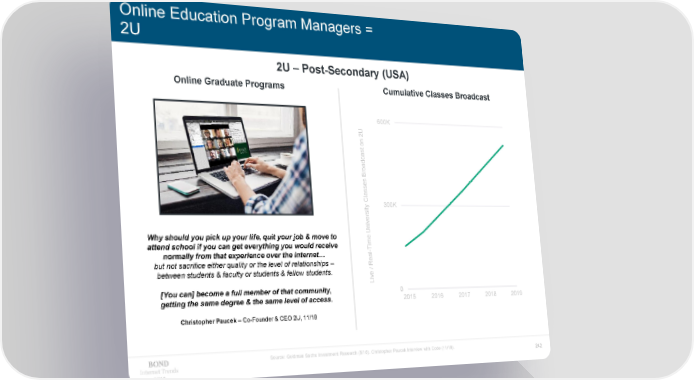 Online Education Program Managers = 2U 2U – Post-Secondary (USA) Online Graduate Programs Cumulative Classes Broadcast ds600K on 2Uan t us as ho oadc T Br es s as l C 300K ty i s er v ni U Why should you pick up your life, quit your job & move to e m attend school if you can get everything you would receive i T - normally from that experience over the Internet… l but not sacrifice either quality or the level of relationships – / Rea between students & faculty or students & fellow students. e v Li [You can] become a full member of that community, 0 getting the same degree & the same level of access. 2015 2016 2017 2018 2019 Christopher Paucek – Co-Founder & CEO 2U, 11/18 Source: Goldman Sachs Investment Research (5/18). Christopher Paucek Interview with Code (11/18). Internet Trends 242 2019