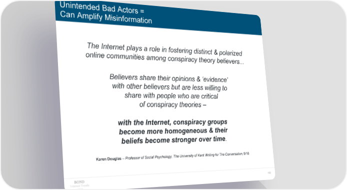 Unintended Bad Actors = Can Amplify Misinformation The Internet plays a role in fostering distinct & polarized online communities among conspiracy theory believers... Believers share their opinions & ‘evidence’ with other believers but are less willing to share with people who are critical of conspiracy theories – with the Internet, conspiracy groups become more homogeneous & their beliefs become stronger over time. Karen Douglas – Professor of Social Psychology, The University of Kent Writing for The Conversation, 6/18 Internet Trends 180 2019