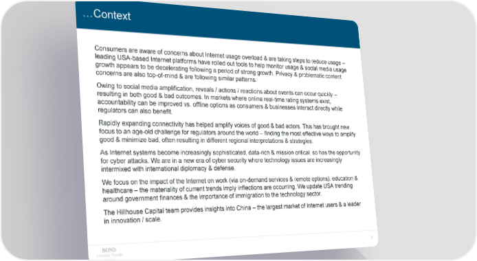 …Context Consumers are aware of concerns about Internet usage overload & are taking steps to reduce usage – leading USA-based Internet platforms have rolled out tools to help monitor usage & social media usage growth appears to be decelerating following a period of strong growth. Privacy & problematic content concerns are also top-of-mind & are following similar patterns. Owing to social media amplification, reveals / actions / reactions about events can occur quickly – resulting in both good & bad outcomes. In markets where online real-time rating systems exist, accountability can be improved vs. offline options as consumers & businesses interact directly while regulators can also benefit. Rapidly expanding connectivity has helped amplify voices of good & bad actors. This has brought new focus to an age-old challenge for regulators around the world – finding the most effective ways to amplify good & minimize bad, often resulting in different regional interpretations & strategies. As Internet systems become increasingly sophisticated, data-rich & mission critical, so has the opportunity for cyber attacks. We are in a new era of cyber security where technology issues are increasingly intermixed with international diplomacy & defense. We focus on the impact of the Internet on work (via on-demand services & remote options), education & healthcare – the materiality of current trends imply inflections are occurring. We update USA trending around government finances & the importance of immigration to the technology sector. The Hillhouse Capital team provides insights into China – the largest market of Internet users & a leader in innovation / scale. Internet Trends 5 2019