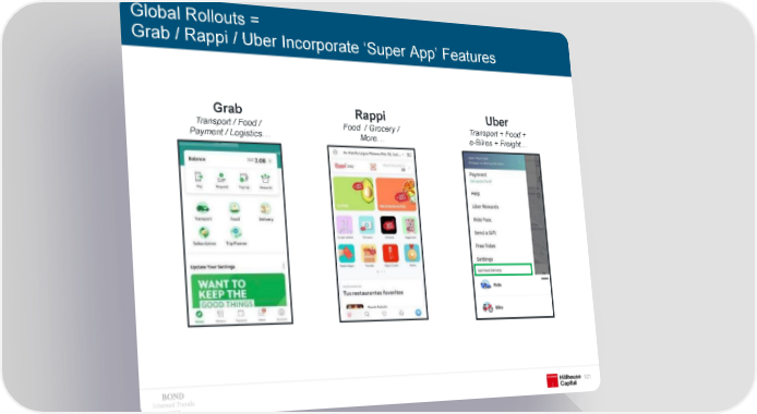 Global Rollouts = Grab / Rappi / Uber Incorporate ‘Super App’ Features Grab Rappi Uber Transport / Food / Food / Grocery / Transport + Food + Payment / Logistics… More… e-Bikes + Freight… Internet Trends 321 2019