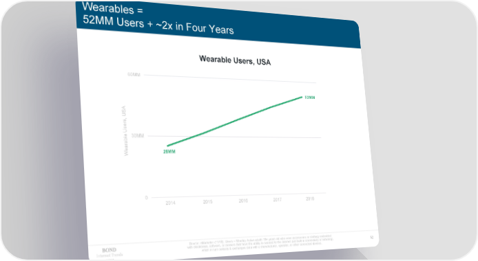 Wearables = 52MM Users + ~2x in Four Years Wearable Users, USA 60MM 52MM A S U sers, U e 30MM earabl 25MM W 0 2014 2015 2016 2017 2018 Source: eMarketer (11/18). Users = Monthly Active adults 18+ years old who wear accessories or clothing embedded with electronics, software, or sensors that have the ability to connect to the Internet (via built-in connectivity or tethering), Internet Trends which in turn collects & exchanges data with a manufacturer, operator, or other connected devices. 52 2019