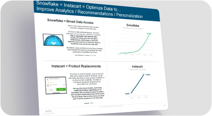 Snowflake + Instacart = Optimize Data to… Improve Analytics / Recommendations / Personalization Snowflake = Broad Data Access Snowflake There's a lot of value in business data, but most Monthly Active Customers companies struggle to extract that value. ~2,000 The issue is with existing technology. The list of challenges we hear from our customers is consistent: Data is segregated into separate silos, significant energy goes into managing infrastructure, concurrency & resource limitations get in the way of business needs & overall the tools are hard to work with. Snowflake's unique architecture solves these problems being built from the ground up to leverage the scale, performance & elasticity of the cloud. 2014 2015 2016 2017 2018 2019 Frank Slootman – Snowflake, CEO, 6/19 Instacart = Product Replacements Instacart Households Covered Every time an Instacart shopper scans an item into 100MM+ their cart or marks an item as “not found,” we get information that helps us make granular predictions of an item’s in-store availability. This helps us recommend appropriate replacements for items likely to be out-of-stock. Among other improvements, performing complicated feature engineering in our Snowflake data warehouse instead of python, this new [item replacement] tool, which scores <20MM 15x more items than previous tools, was built with 1/5 of the resources in 1/4 of the time. 2016 2017 2018 Instacart – 12/18 Source: Snowflake (5/19). Instacart (12/18). Internet Trends 141 2019